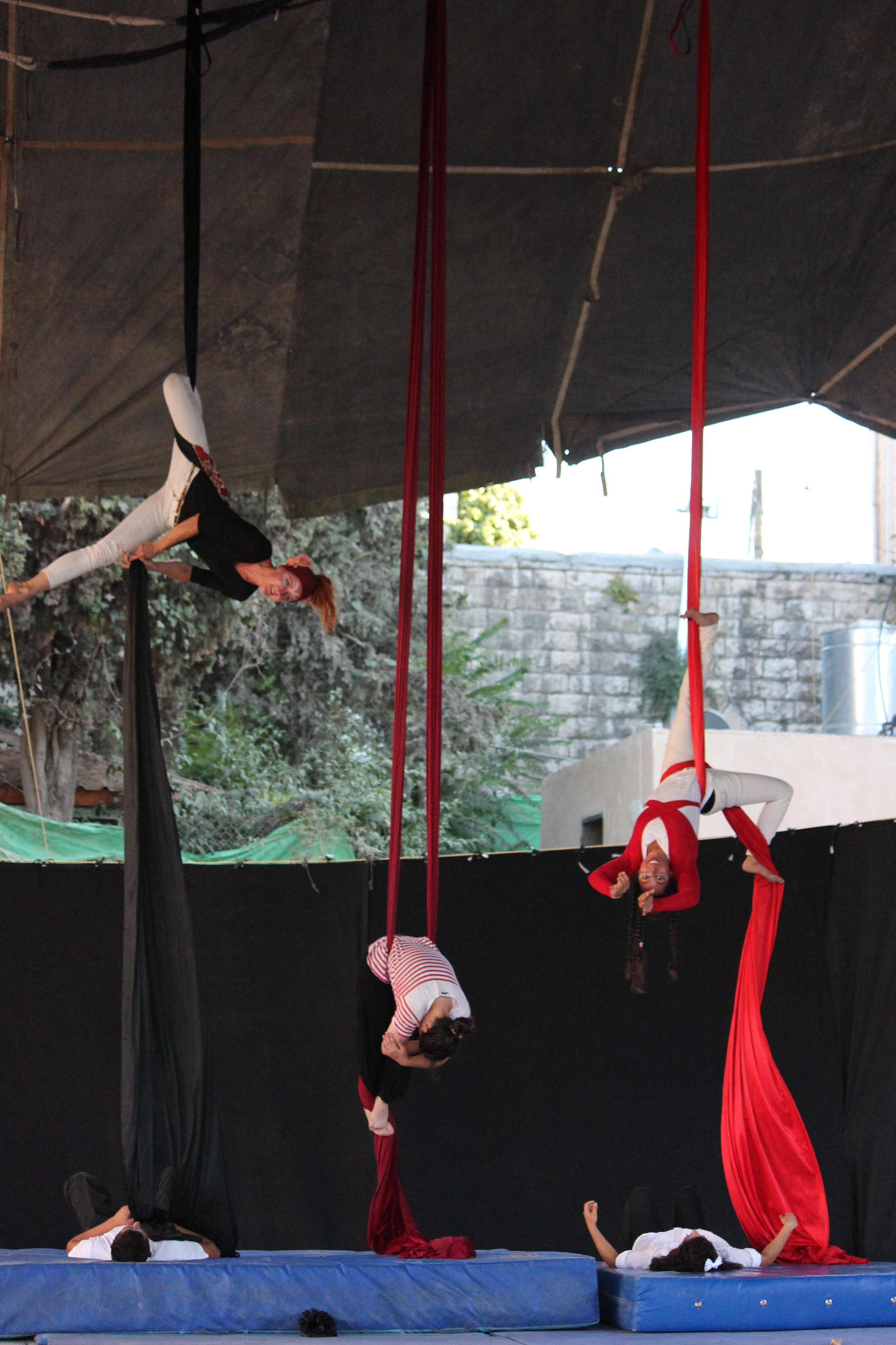 Taken in 2012, this is a colour photograph of a summer school that was organised by the Palestinian Circus School (PCS) in Birzeit, north of Israeli-occupied Ramallah.