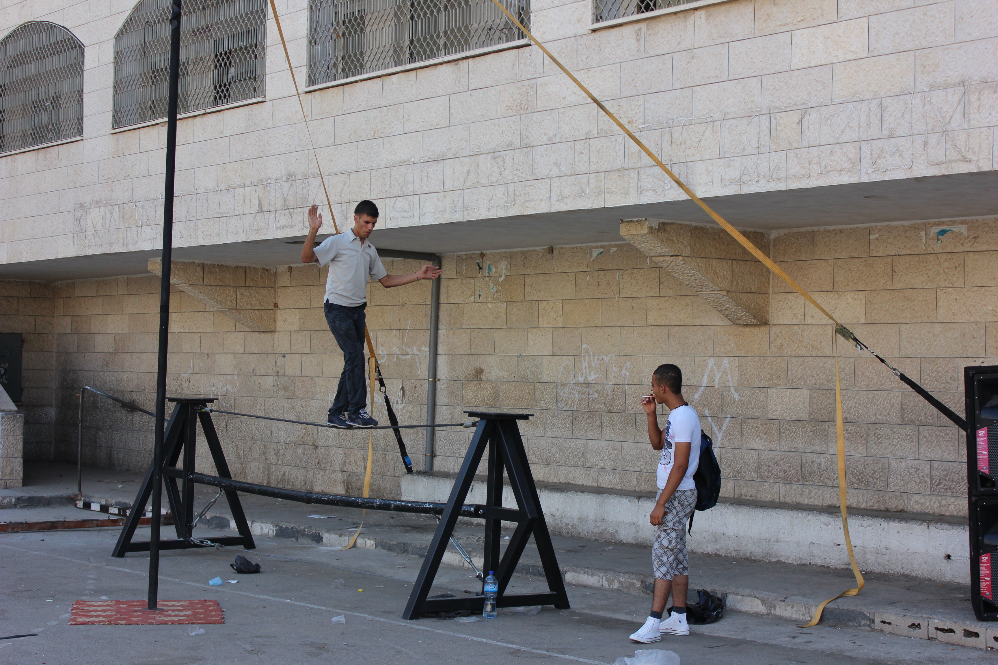 صورة ملوَّنة، التُقطت عام 2012، ترصد جانبًا من مدرسة صيفيَّة نظمتها مدرسة سيرك فلسطين في بلدة بيرزيت شماليّ مدينة رام الله المحتلَّة.