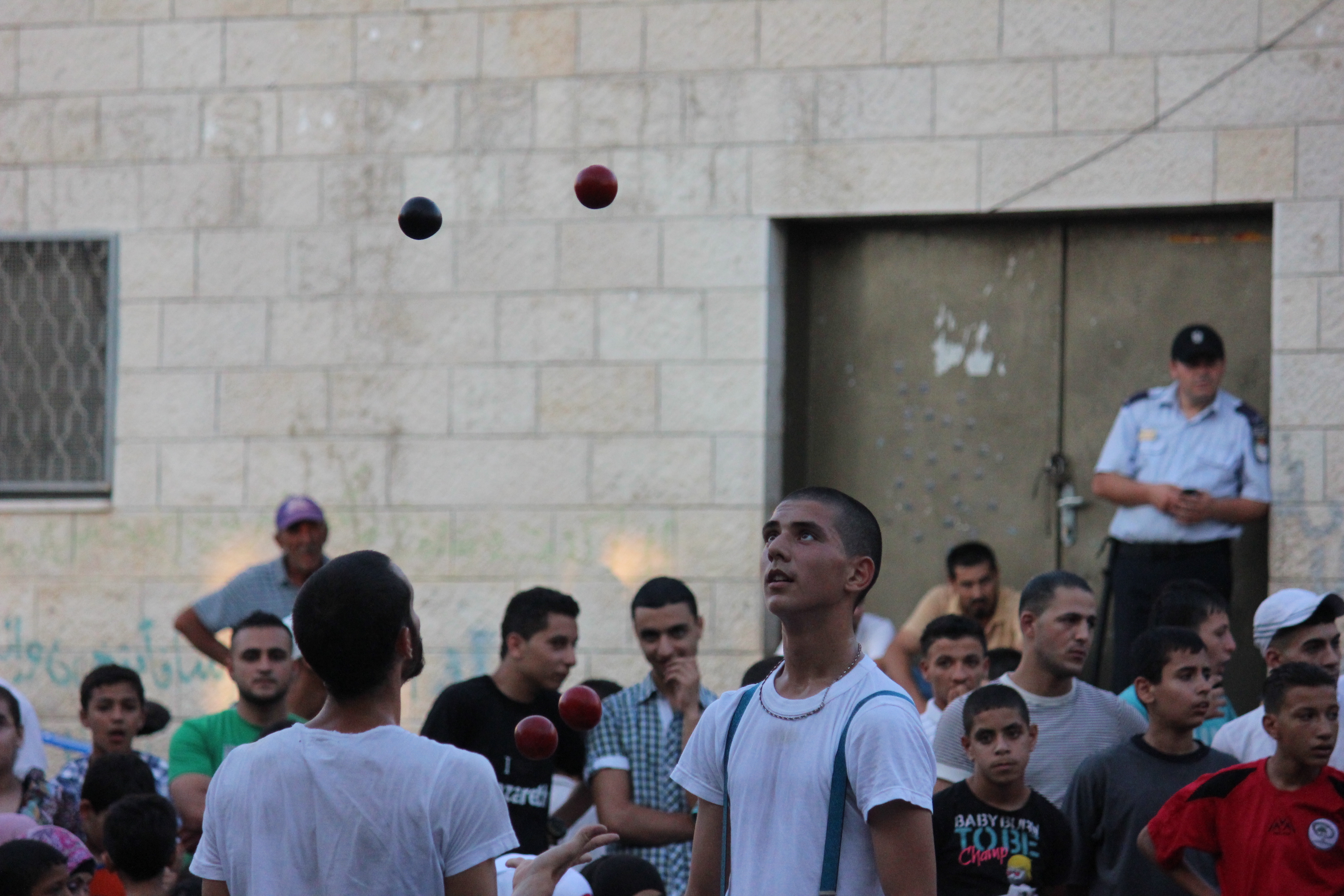 صورة ملوَّنة، التُقطت عام 2012، ترصد جانبًا من مدرسة صيفيَّة نظمتها مدرسة سيرك فلسطين في بلدة بيرزيت شماليّ مدينة رام الله المحتلَّة.