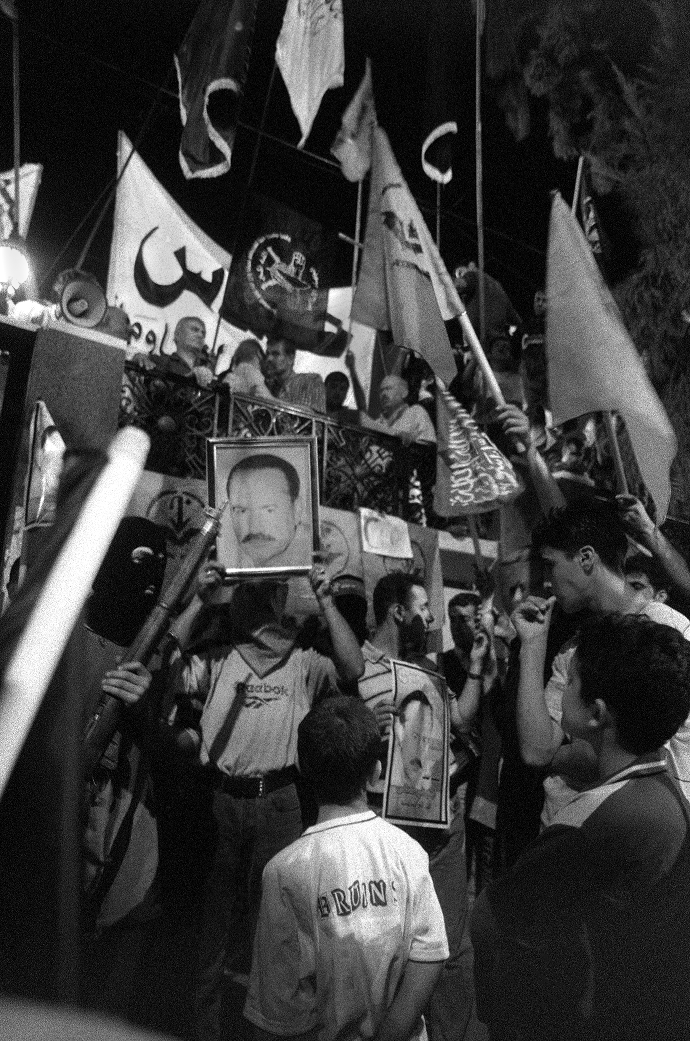 صورة التقطتها جوس دراي لمظاهرة شعبية في الخليل منظمة من قبل جميع الاحزاب السياسية الفلسطينية تنديدًا باغتيال الأمين العام للجبهة الشعبية لتحرير فلسطين أبو علي مصطفى.