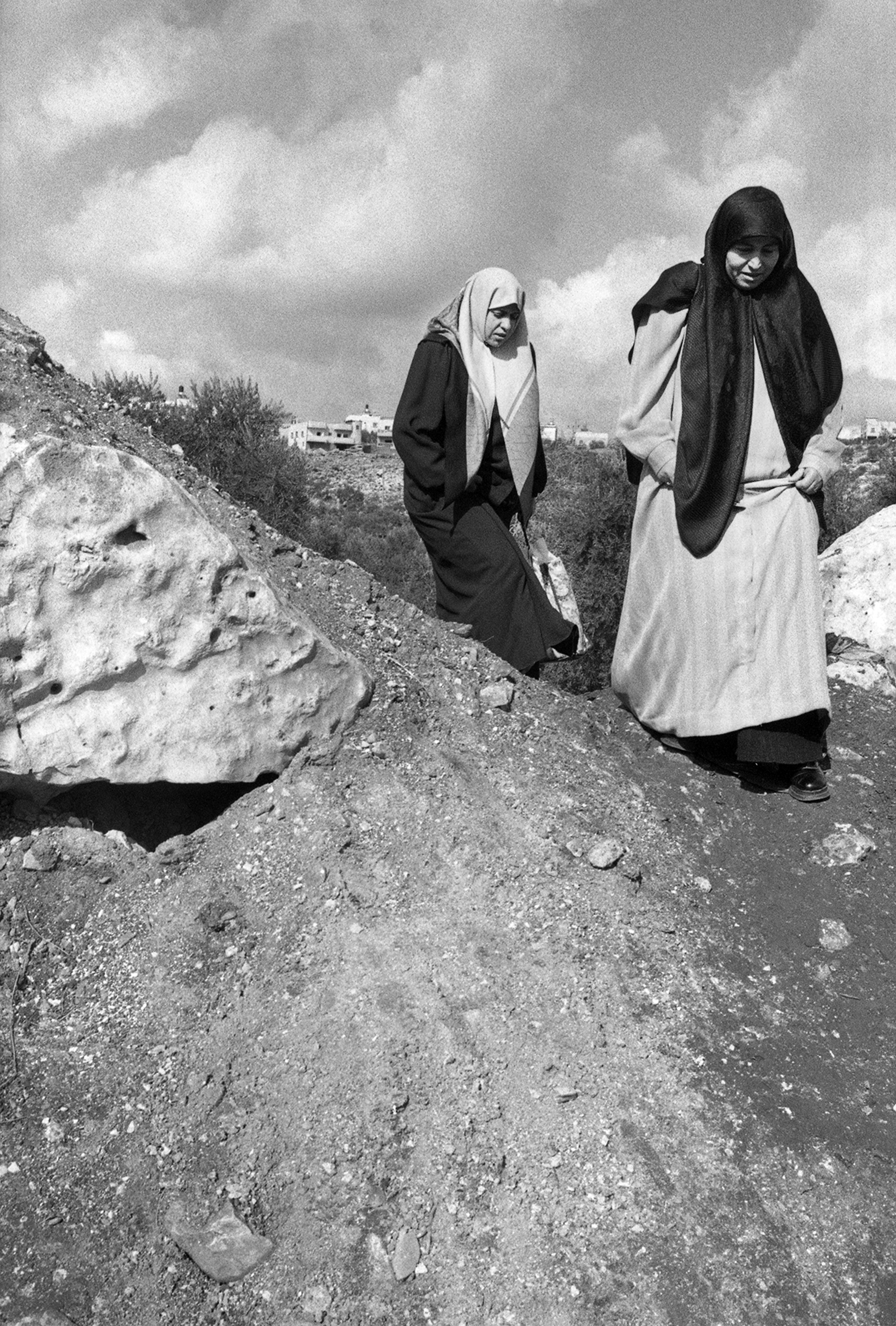 A black-and-white photograph capturing a glimpse of the entrance of Silwad town blocked by concrete blocks. The blocks were set up by the Israeli Occupation Forces to prevent the movement of people. Because of this, the town residents were forced to walk in and out of the town on foot.