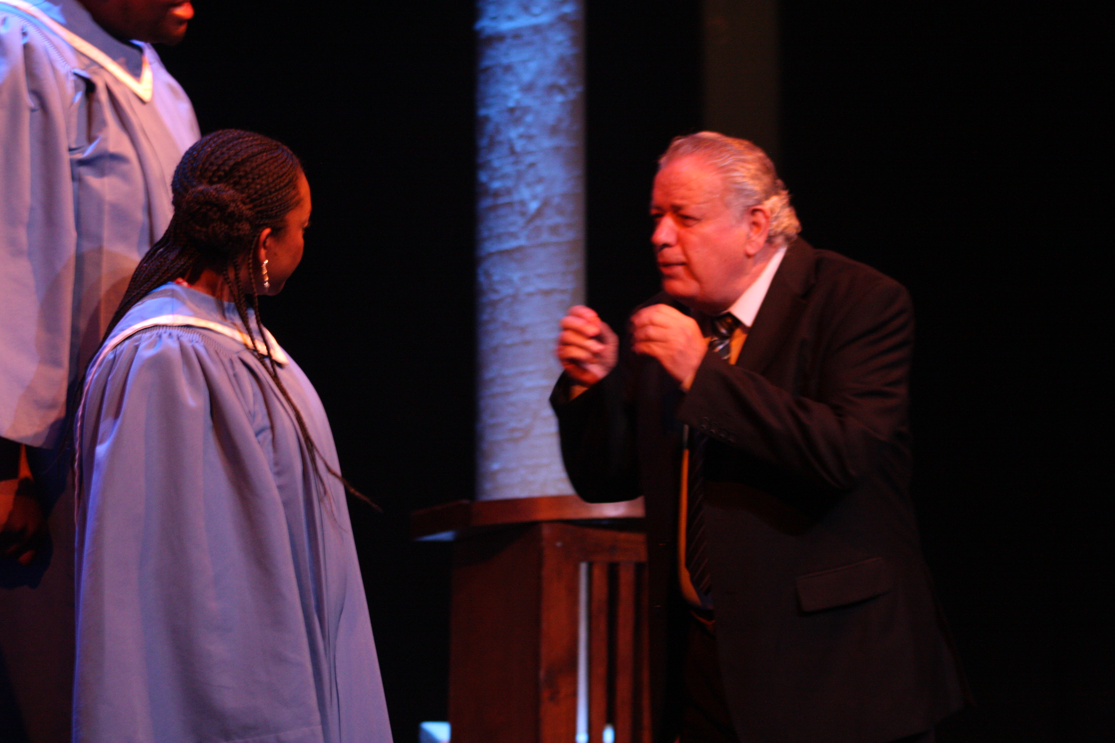 صورة ملونة من عرض مسرحية "محطات مارتن لوثر كنغ" في مسرح وسينماتك القصبة خلال مهرجان أيام المنارة المسرحية عام 2011.
