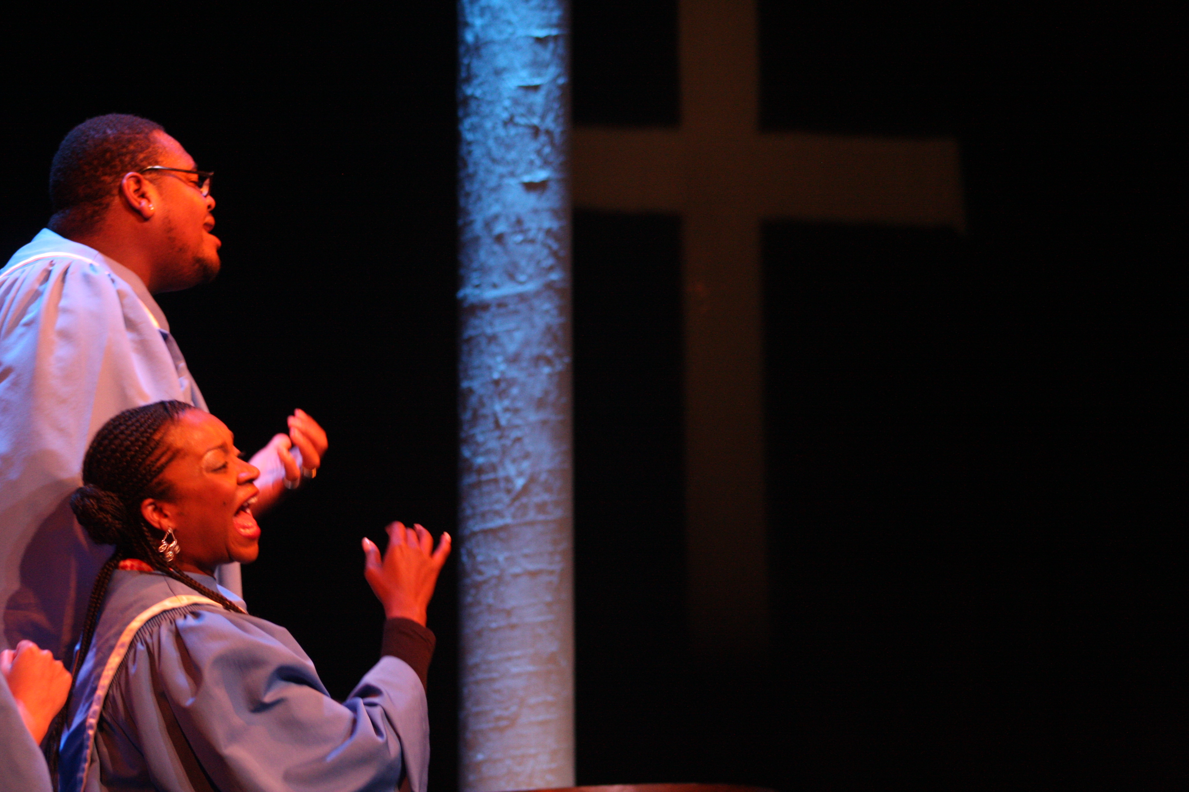 صورة ملونة من عرض مسرحية "محطات مارتن لوثر كنغ" في مسرح وسينماتك القصبة خلال مهرجان أيام المنارة المسرحية عام 2011.