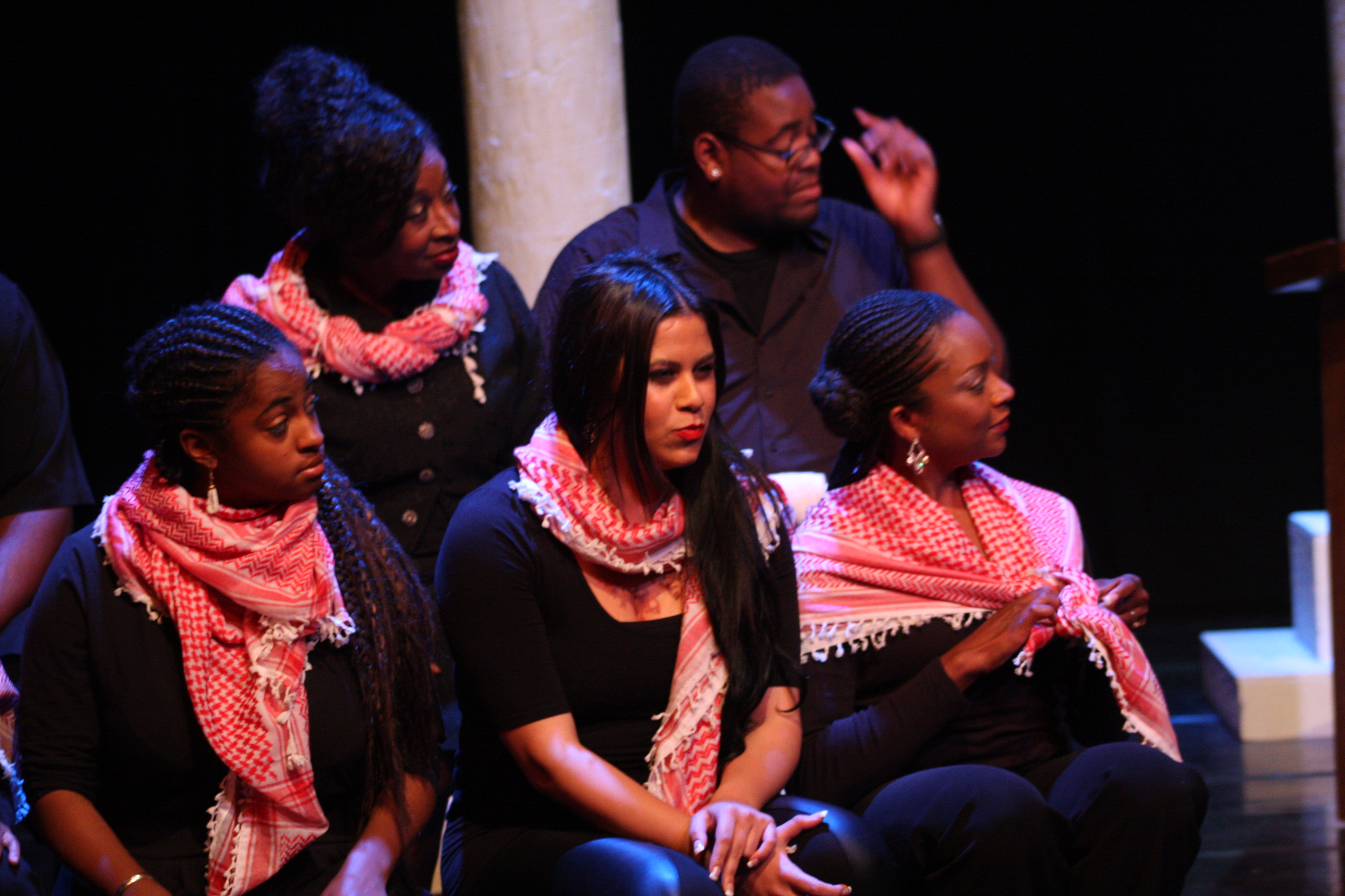 صورة ملونة من عرض مسرحية "محطات مارتن لوثر كنغ" في مسرح وسينماتك القصبة خلال مهرجان أيام المنارة المسرحية عام 2011.