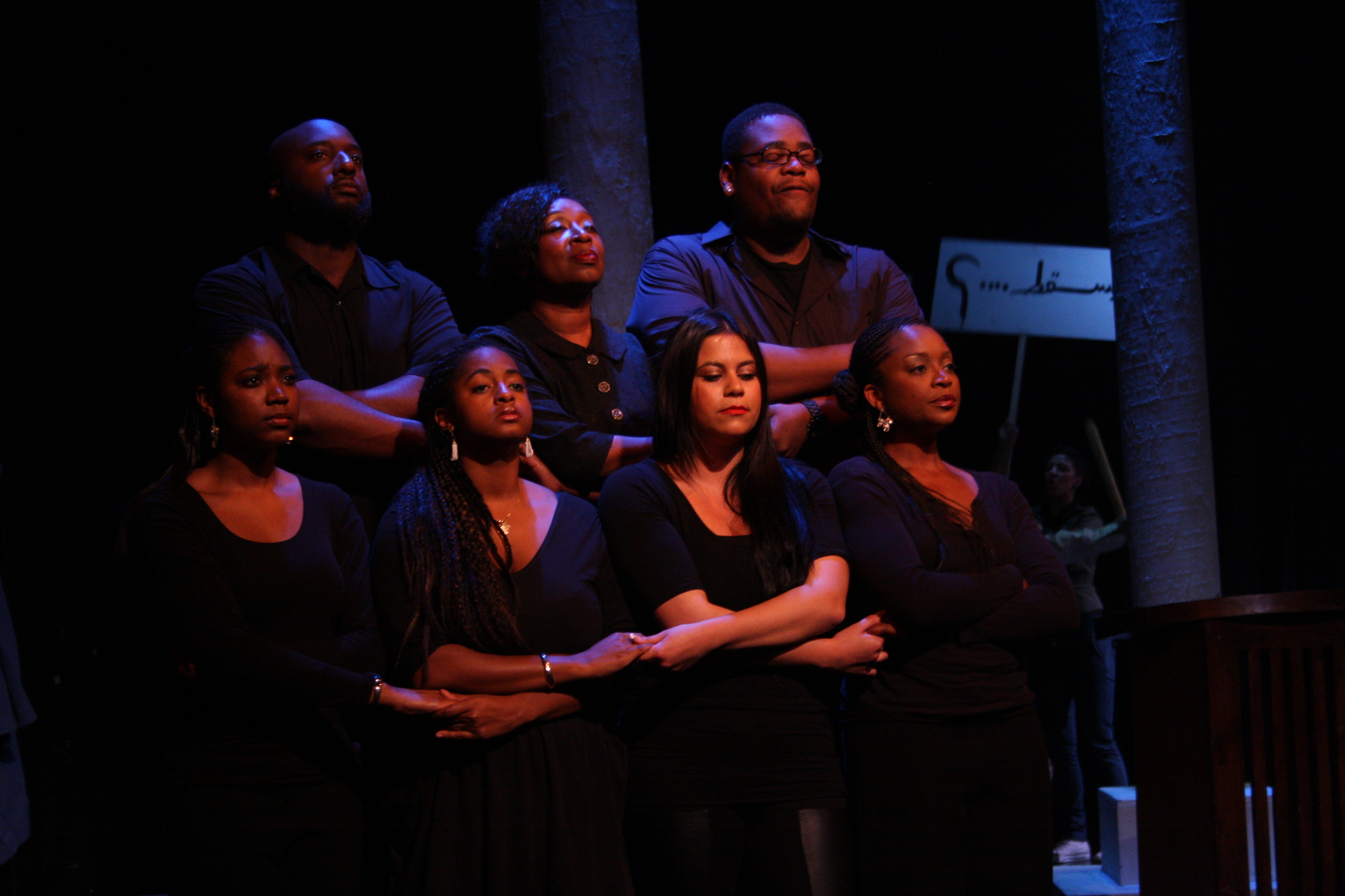 صورة ملونة من عرض مسرحية "محطات مارتن لوثر كنغ" في مسرح وسينماتك القصبة خلال مهرجان أيام المنارة المسرحية عام 2011.