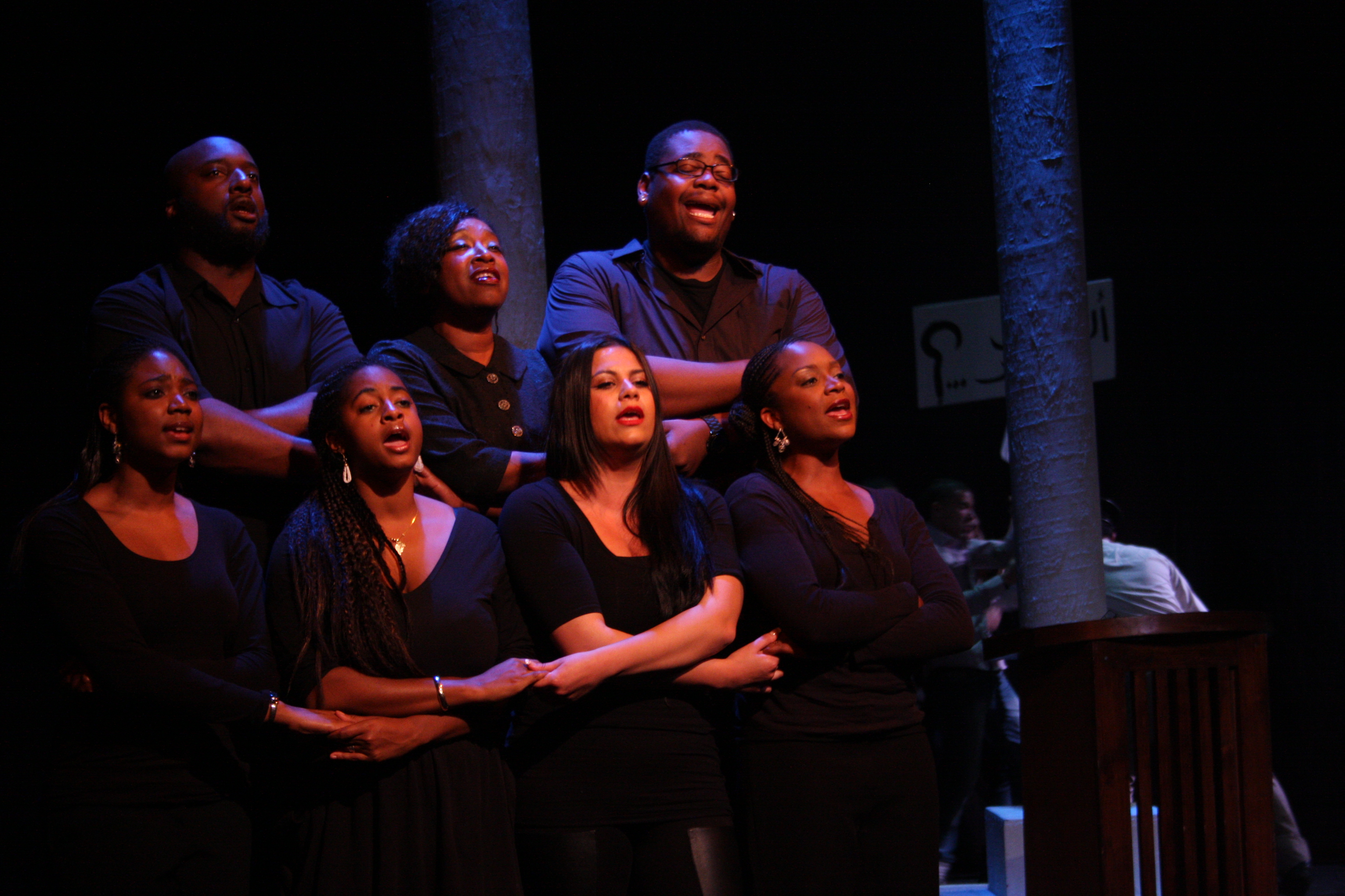 صورة ملونة من عرض مسرحية "محطات مارتن لوثر كنغ" في مسرح وسينماتك القصبة خلال مهرجان أيام المنارة المسرحية عام 2011.
