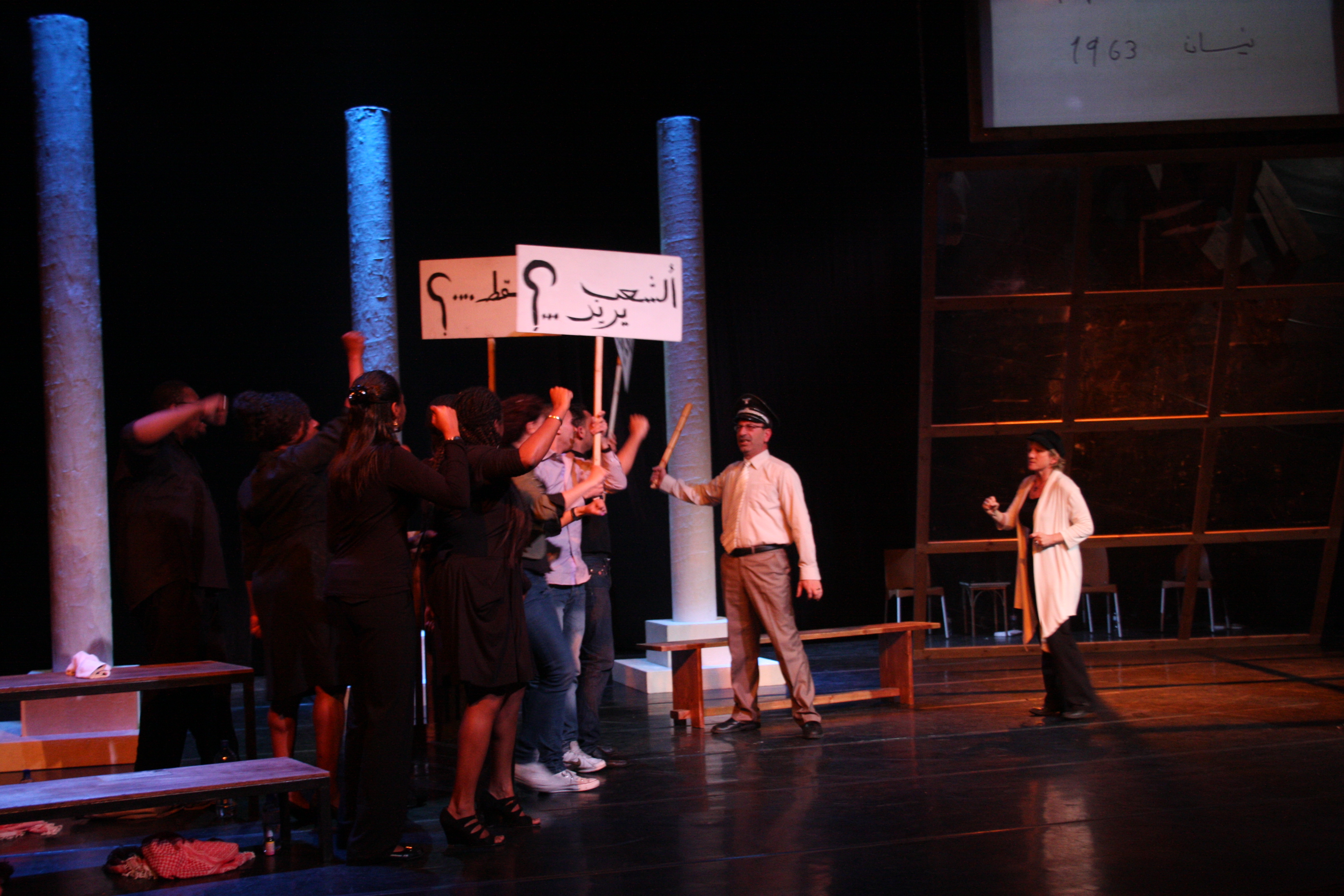 صورة ملونة من عرض مسرحية "محطات مارتن لوثر كنغ" في مسرح وسينماتك القصبة خلال مهرجان أيام المنارة المسرحية عام 2011.