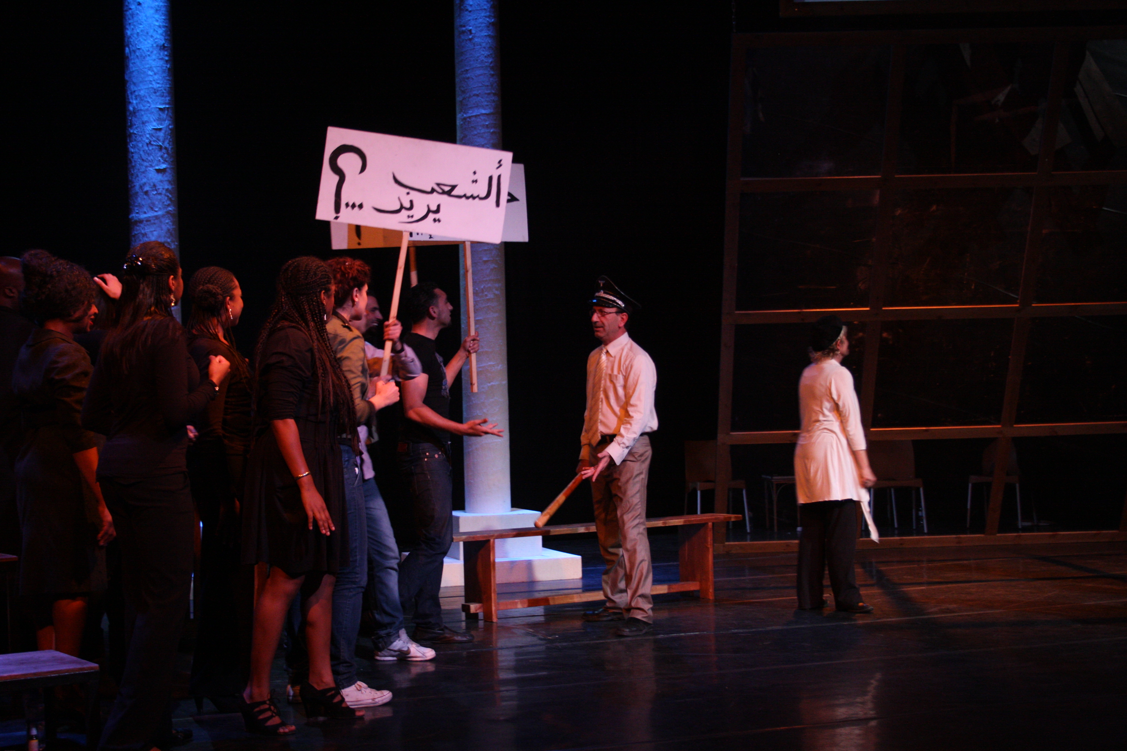 صورة ملونة من عرض مسرحية "محطات مارتن لوثر كنغ" في مسرح وسينماتك القصبة خلال مهرجان أيام المنارة المسرحية عام 2011.