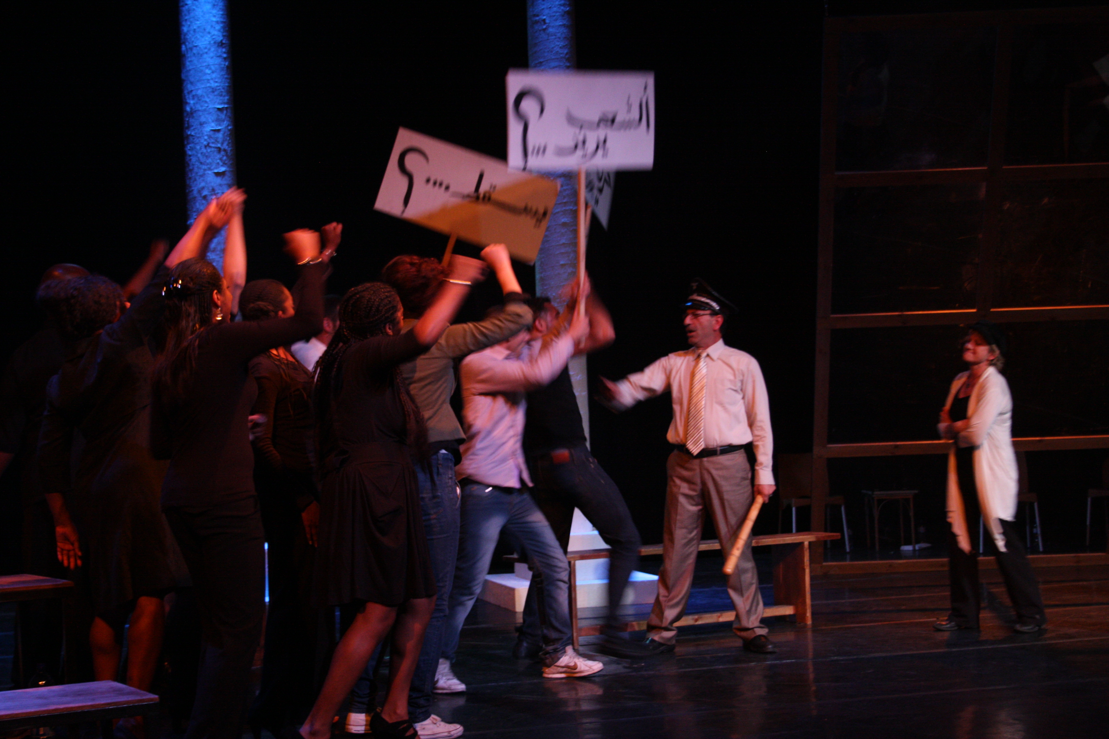 صورة ملونة من عرض مسرحية "محطات مارتن لوثر كنغ" في مسرح وسينماتك القصبة خلال مهرجان أيام المنارة المسرحية عام 2011.