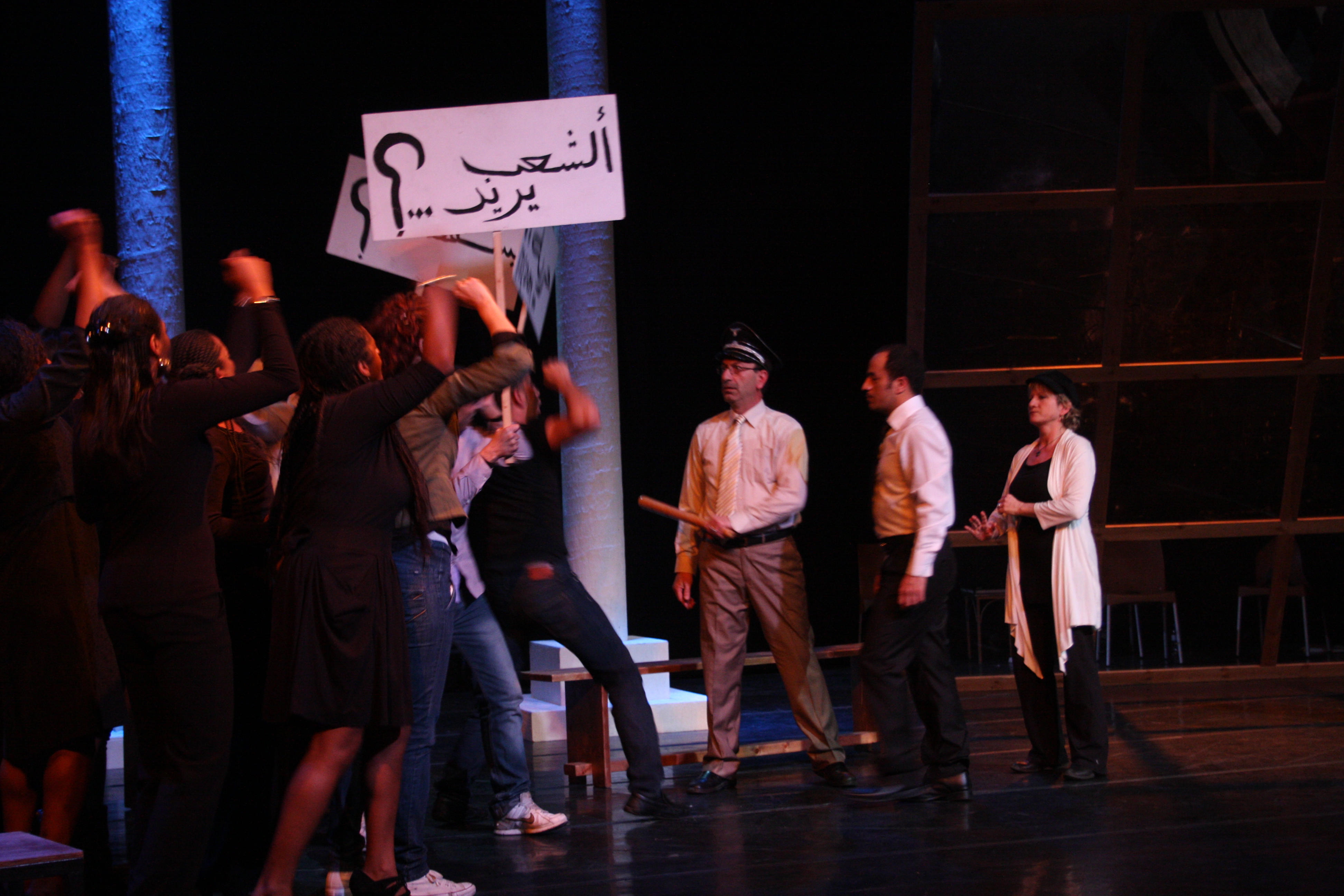 صورة ملونة من عرض مسرحية "محطات مارتن لوثر كنغ" في مسرح وسينماتك القصبة خلال مهرجان أيام المنارة المسرحية عام 2011.