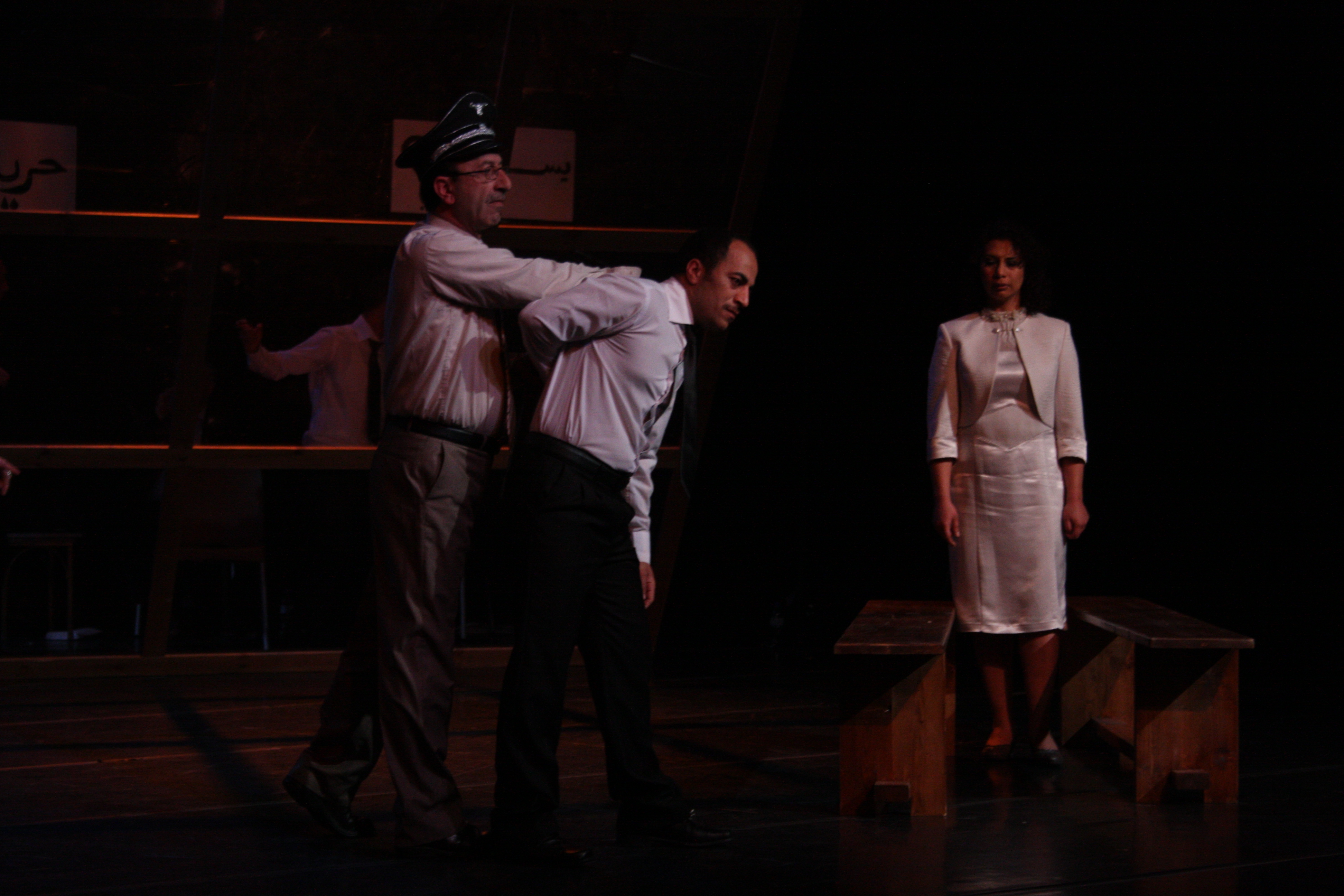 A colour photograph of the performance of "Martin Luther King Stations" play in Al Kasaba Theatre and Cinematheque during Al Manara International Theatre Days, in 2011.