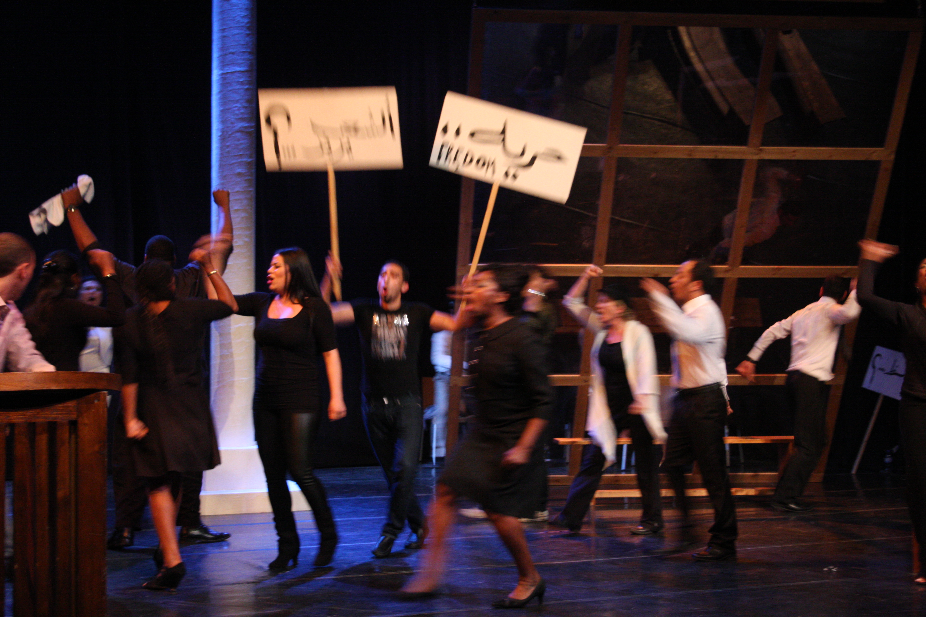 A colour photograph of the performance of "Martin Luther King Stations" play in Al Kasaba Theatre and Cinematheque during Al Manara International Theatre Days, in 2011.