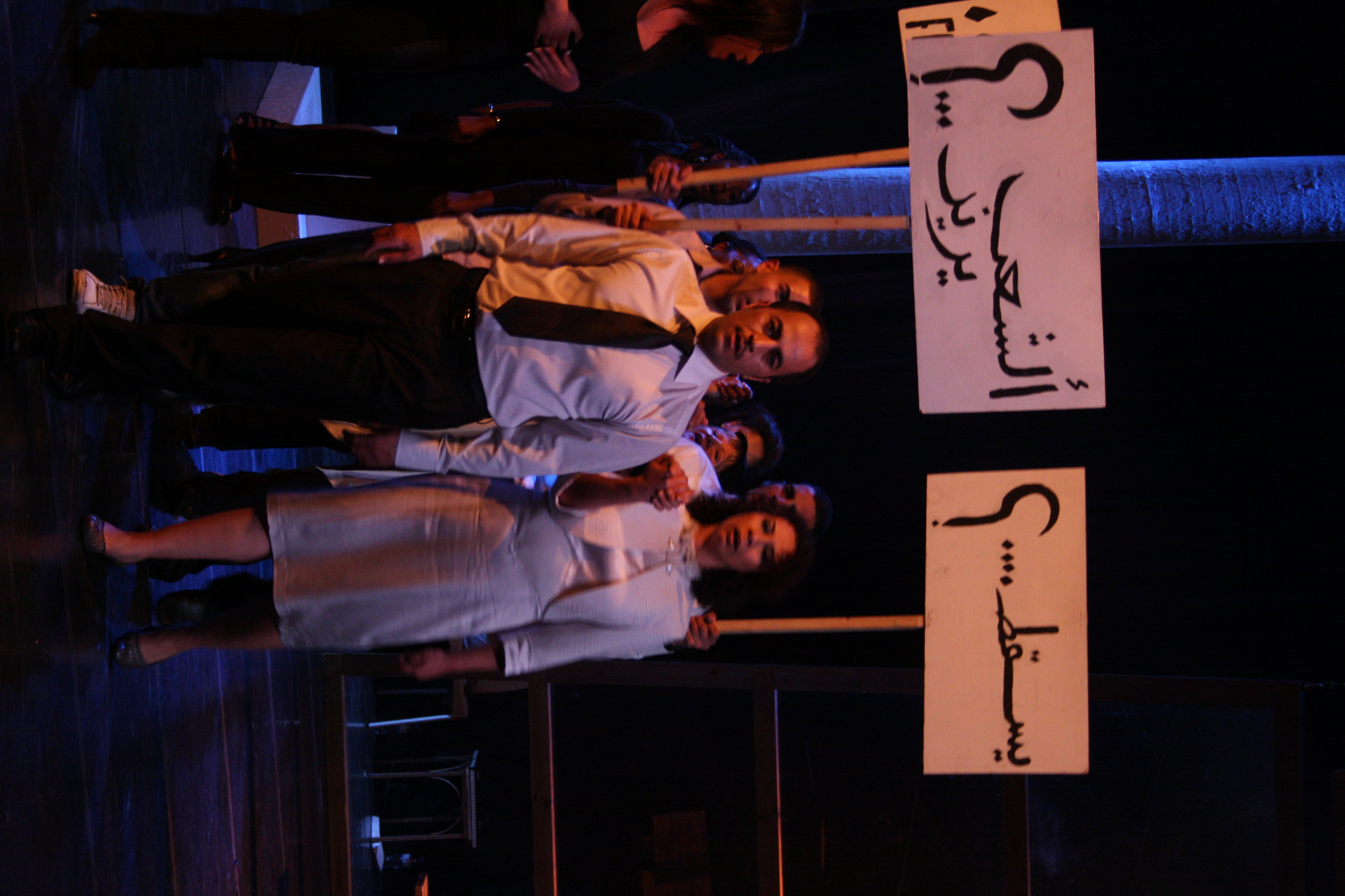 A colour photograph of the performance of "Martin Luther King Stations" play in Al Kasaba Theatre and Cinematheque during Al Manara International Theatre Days, in 2011.