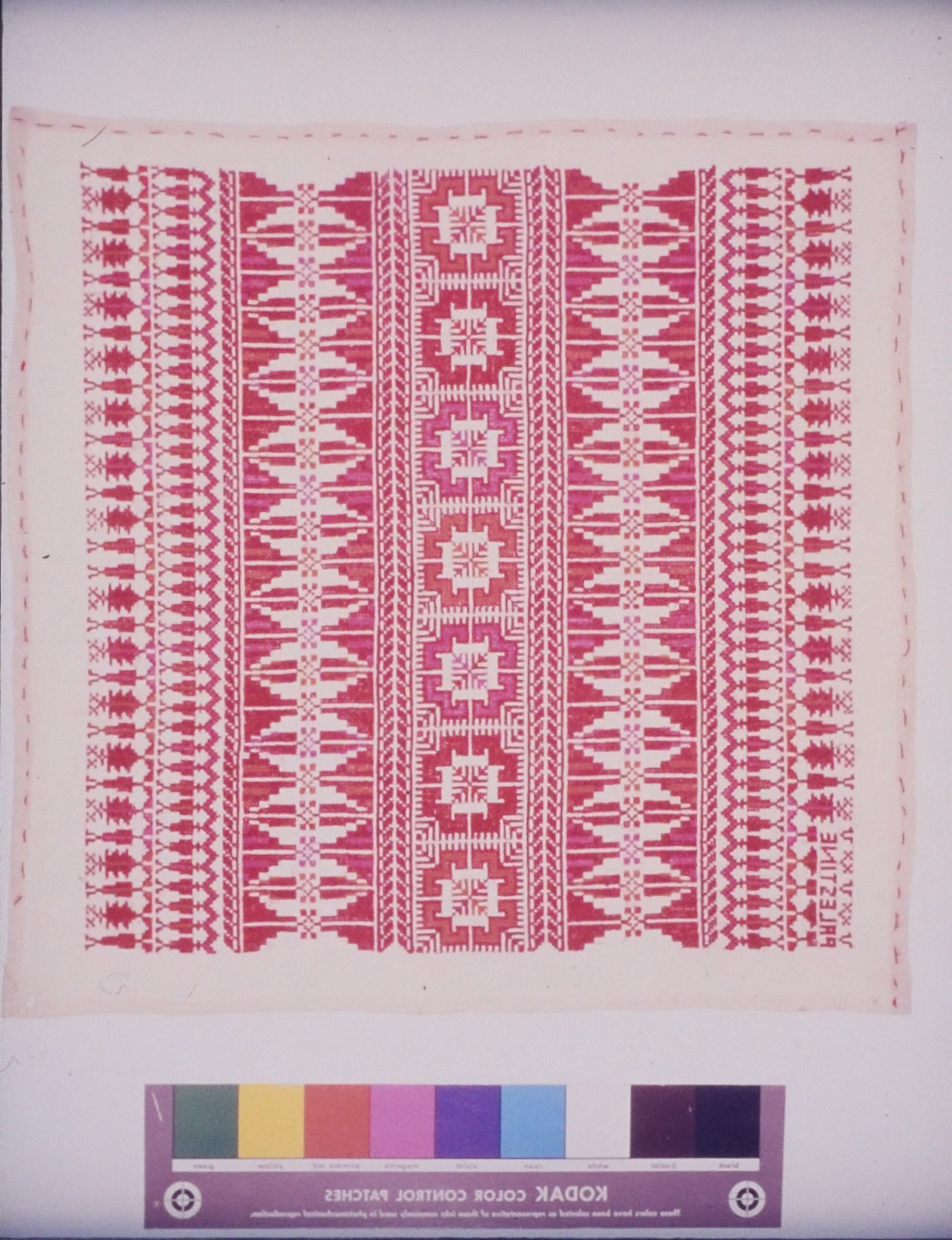 صورة ملونة، يظهر فيها أعمال تطريز يدوي فلسطيني من انتاج جمعية انعاش المخيم.