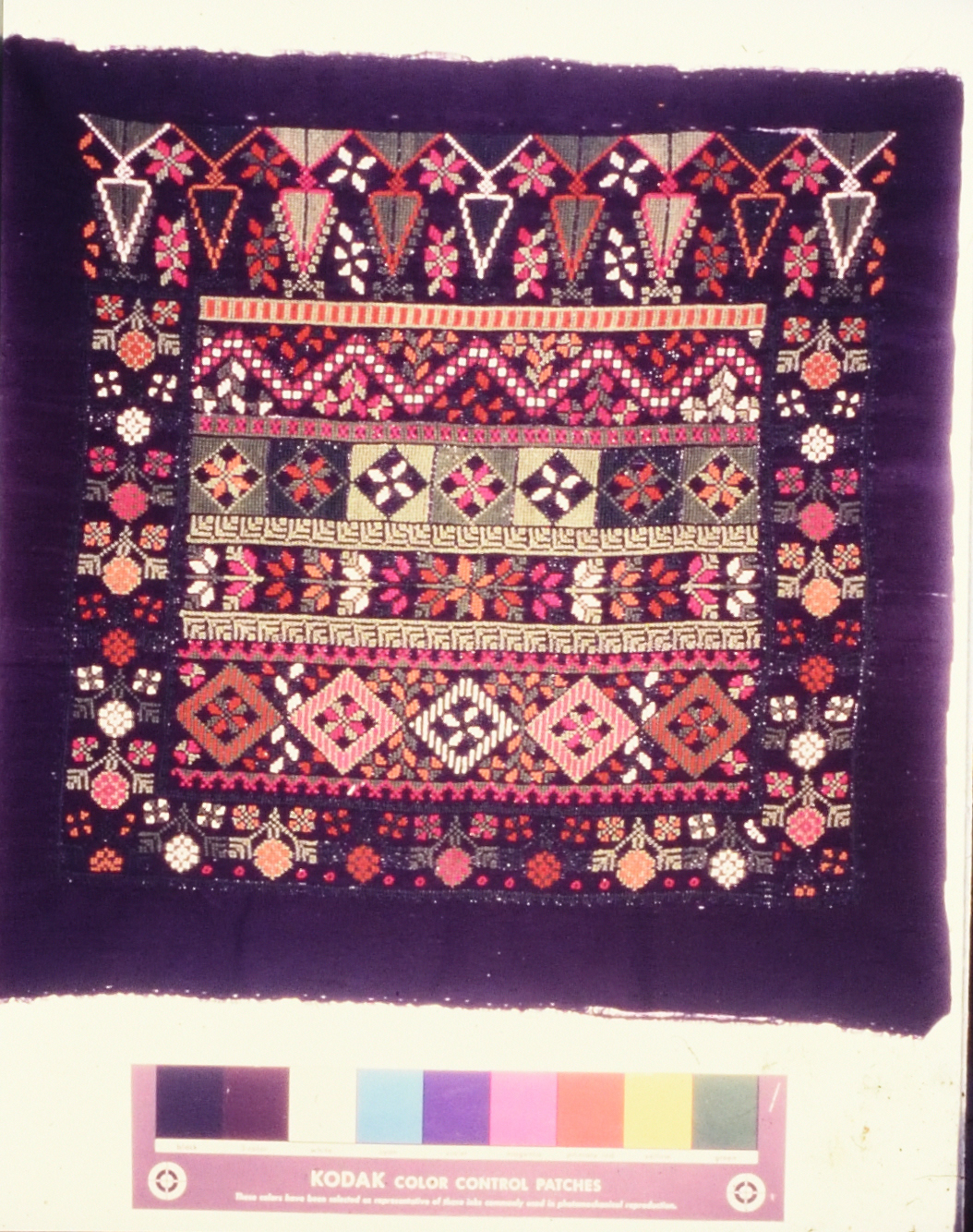 صورة ملونة، يظهر فيها أعمال تطريز يدوي فلسطيني من انتاج جمعية انعاش المخيم.