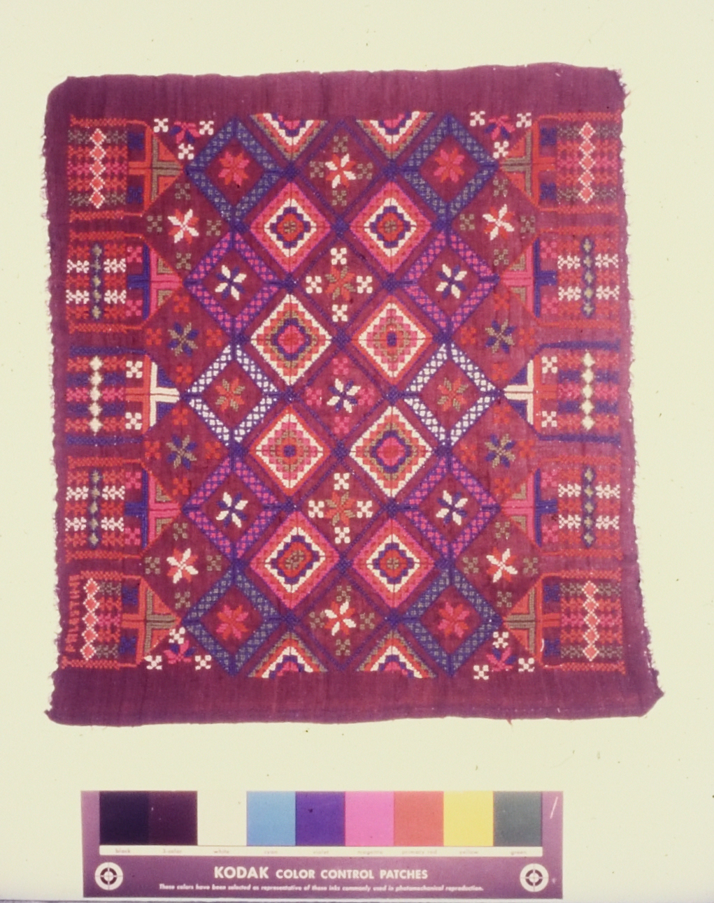 صورة ملونة، يظهر فيها أعمال تطريز يدوي فلسطيني من انتاج جمعية انعاش المخيم.