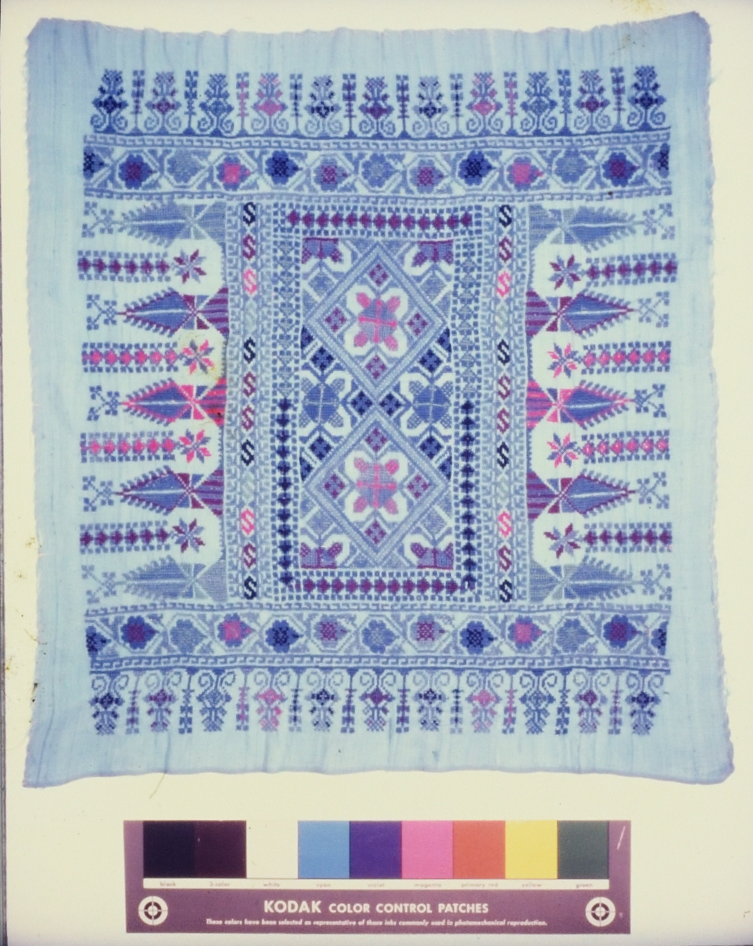 صورة ملونة، يظهر فيها أعمال تطريز يدوي فلسطيني من انتاج جمعية انعاش المخيم.