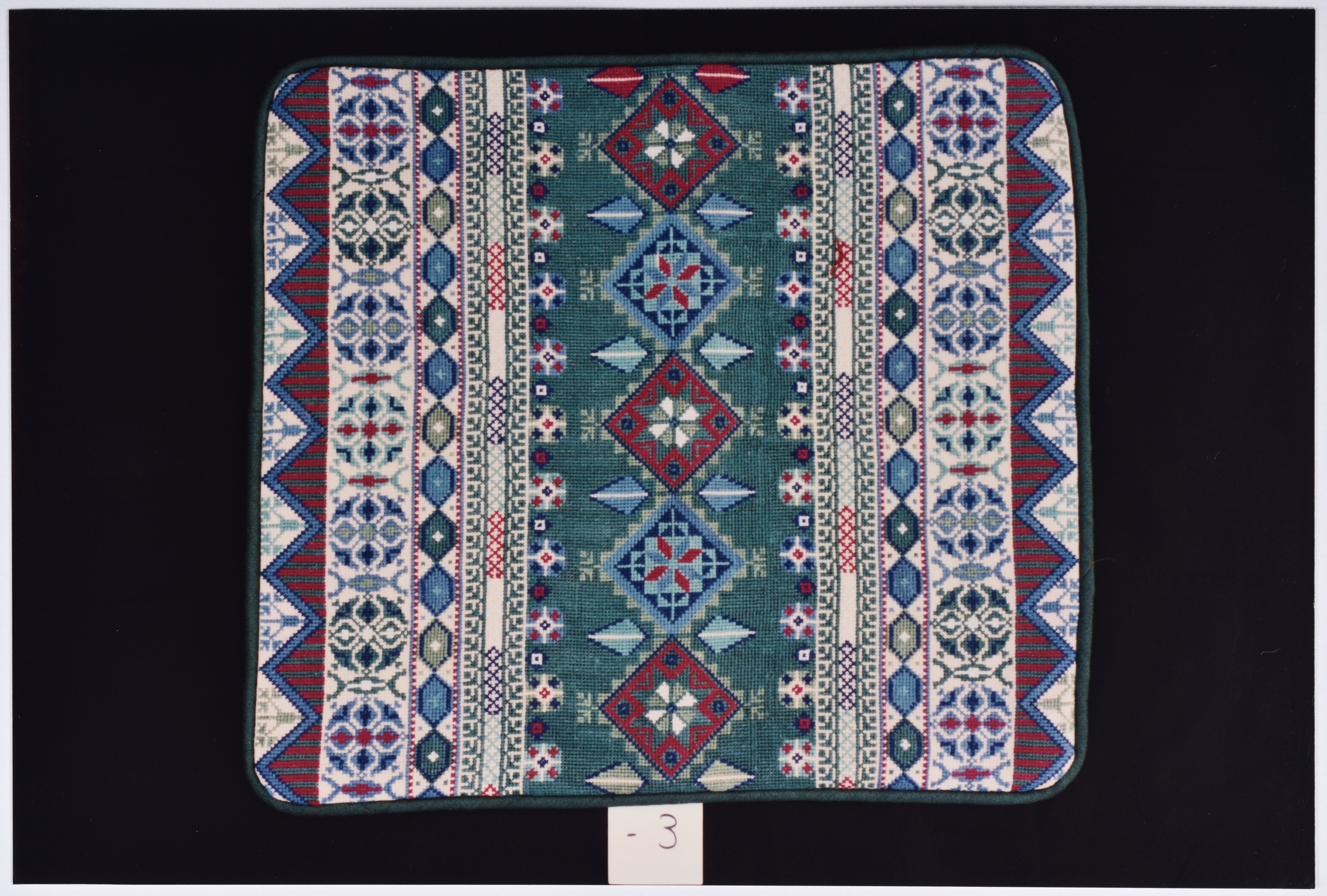 صورة ملونة، يظهر فيها أعمال تطريز يدوي فلسطيني من انتاج جمعية انعاش المخيم.