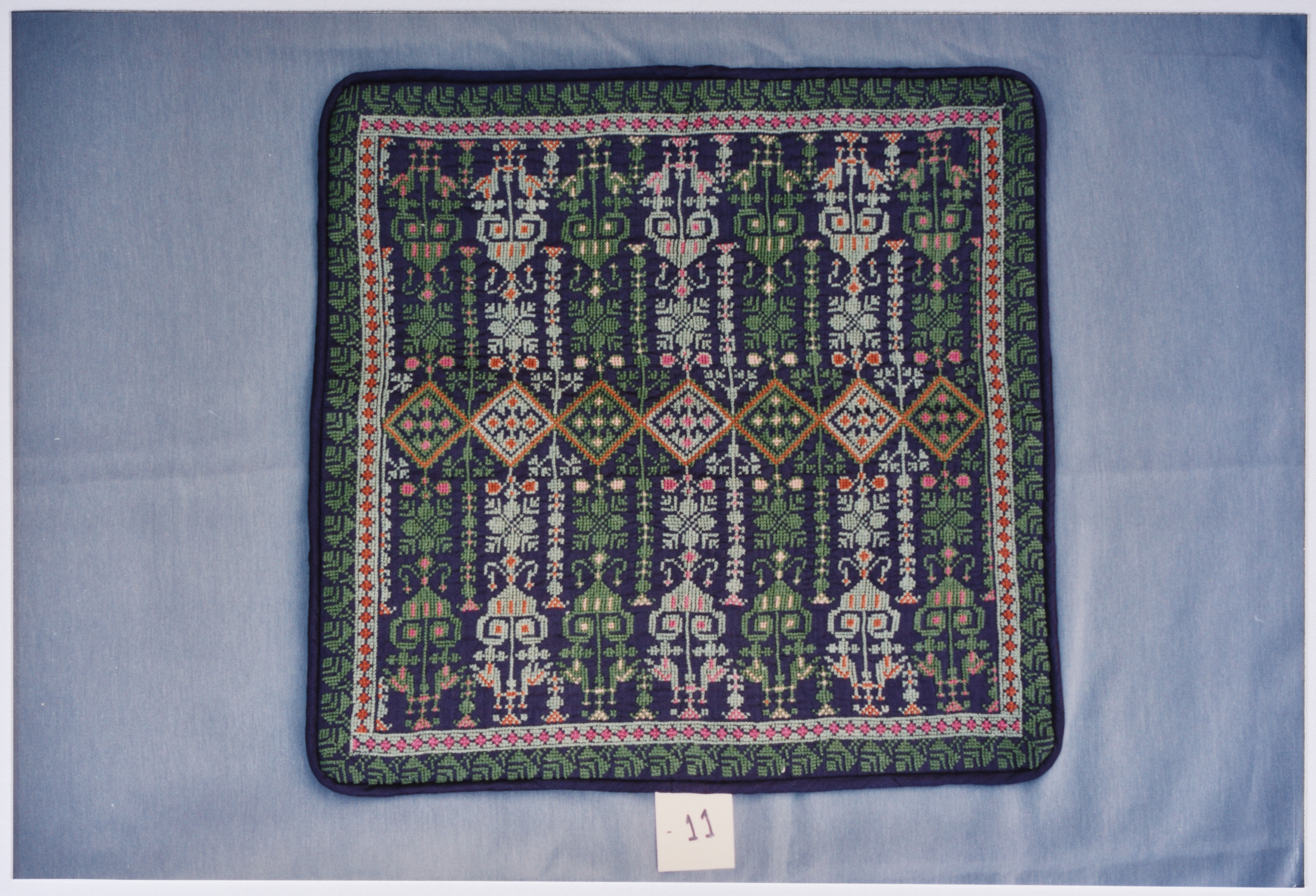 صورة ملونة، يظهر فيها أعمال تطريز يدوي فلسطيني من انتاج جمعية انعاش المخيم.