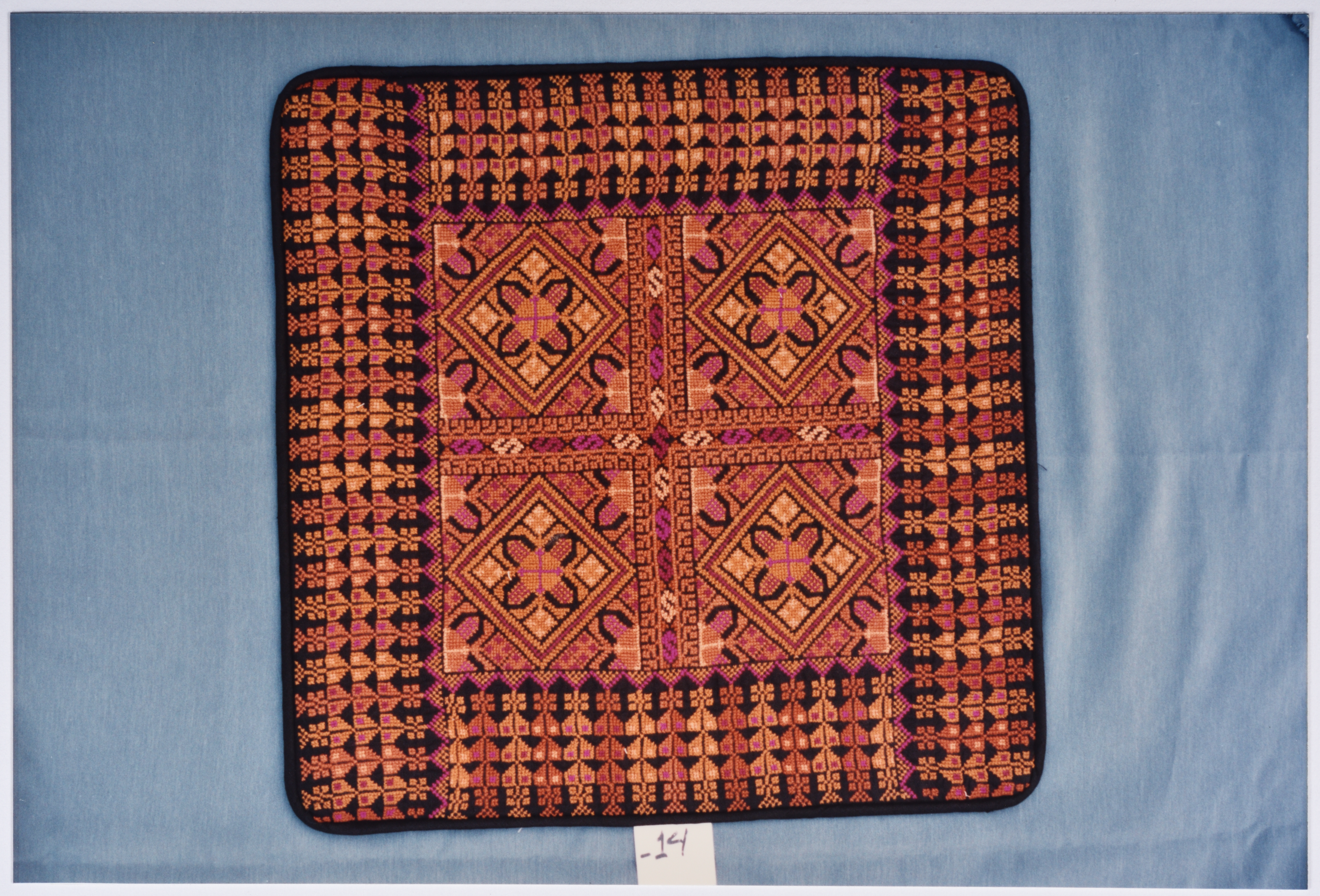 صورة ملونة، يظهر فيها أعمال تطريز يدوي فلسطيني من انتاج جمعية انعاش المخيم.