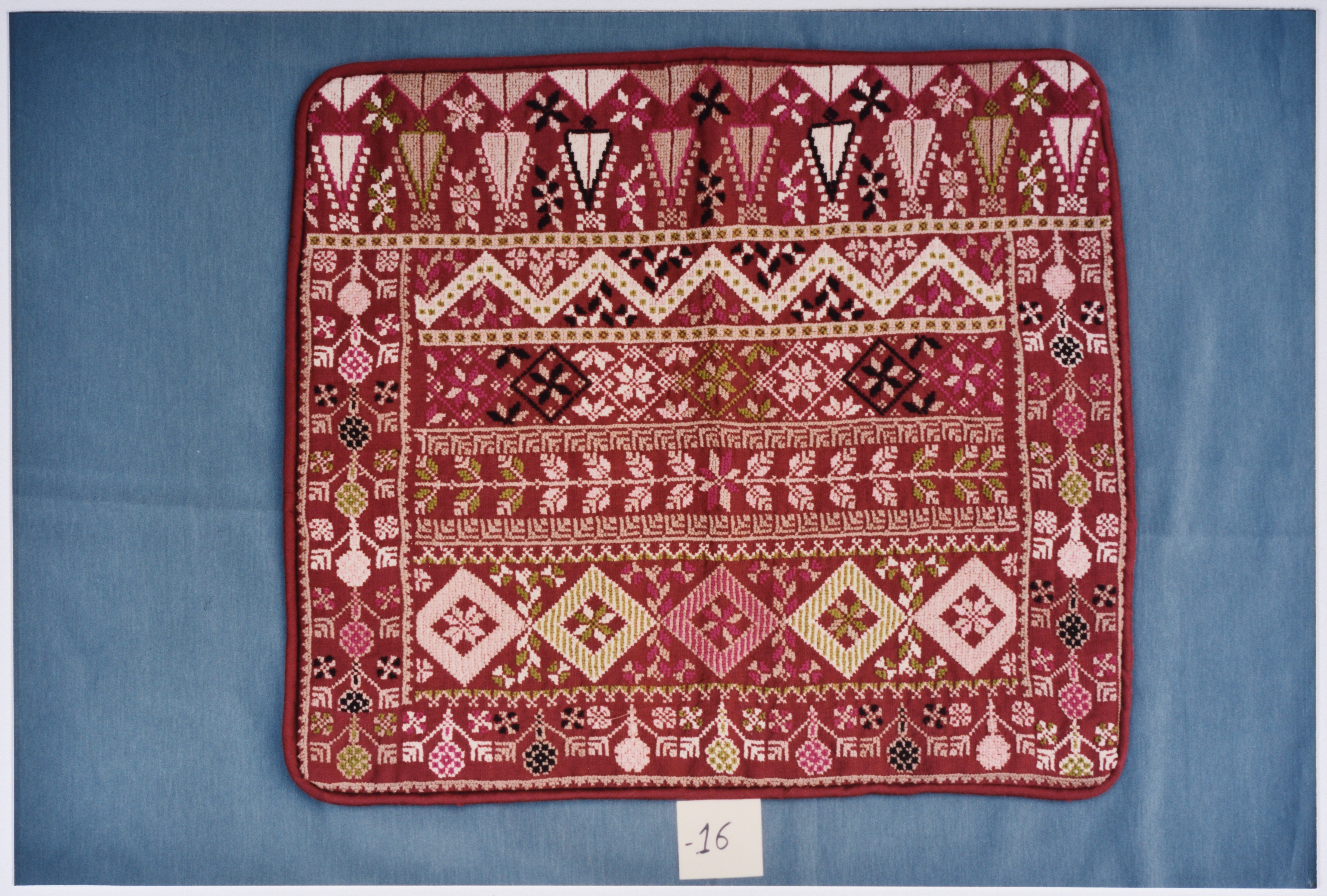 صورة ملونة، يظهر فيها أعمال تطريز يدوي فلسطيني من انتاج جمعية انعاش المخيم.