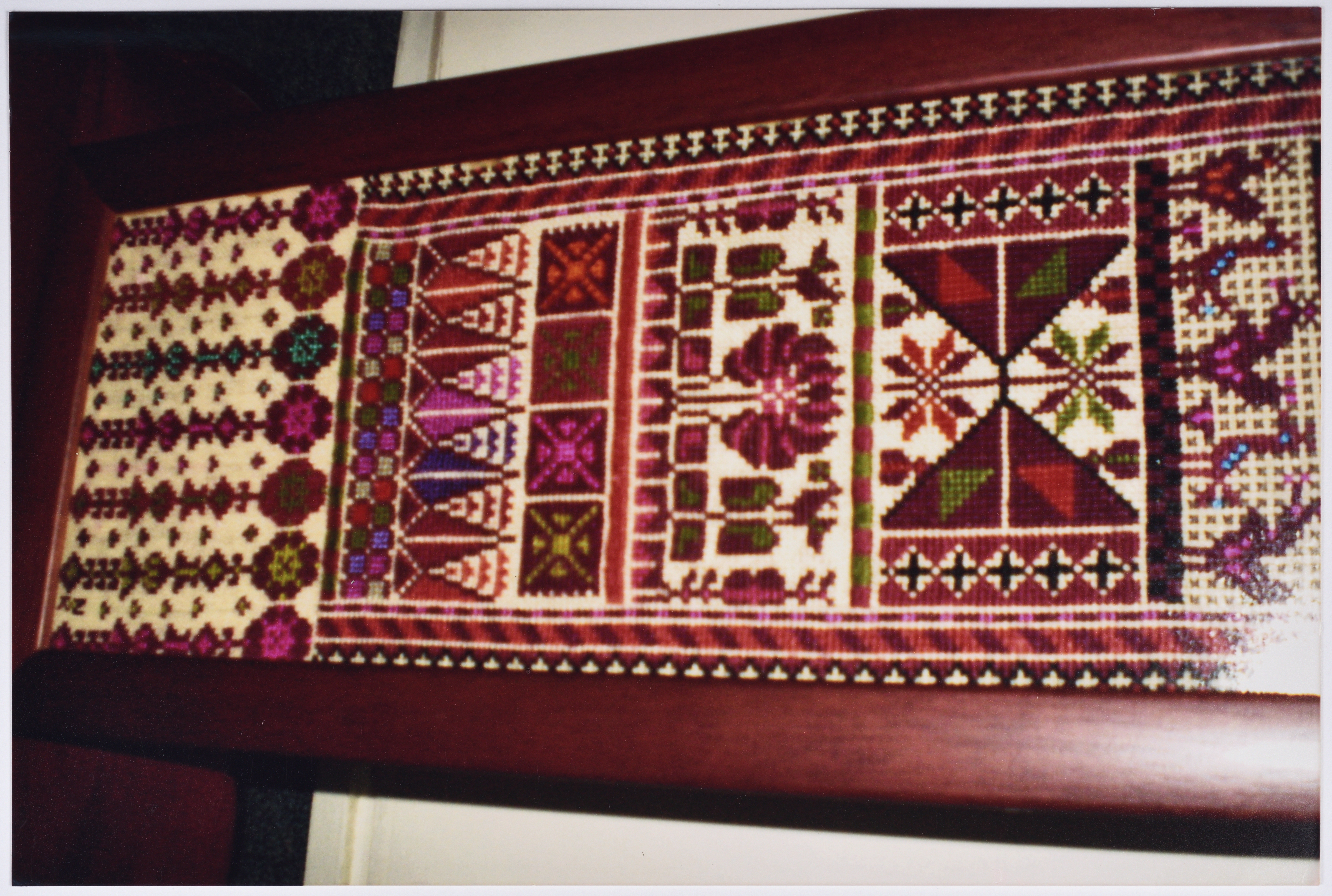 صورة ملونة، يظهر فيها أعمال تطريز يدوي فلسطيني من انتاج جمعية انعاش المخيم.