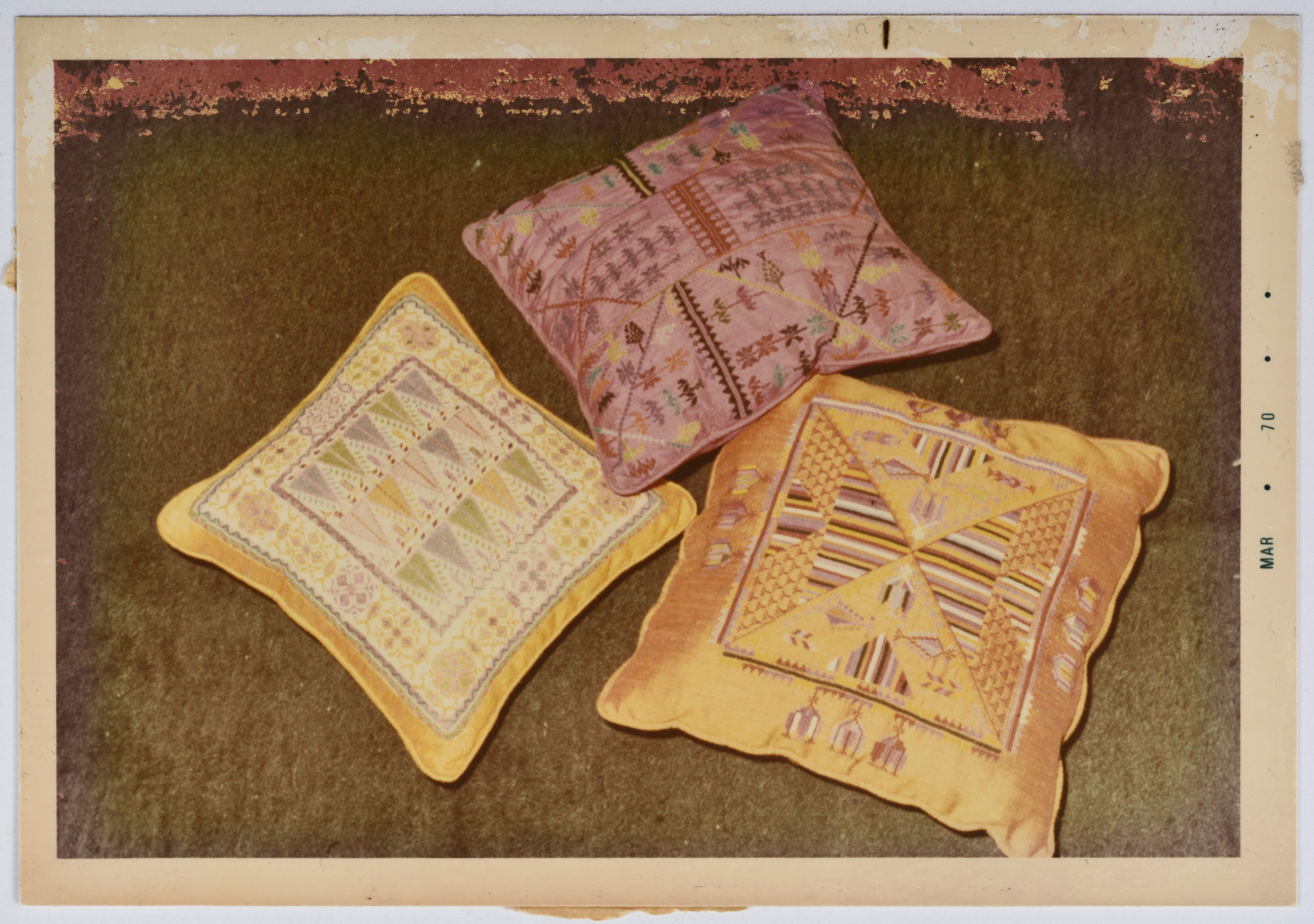 صورة ملونة، يظهر فيها أعمال تطريز يدوي فلسطيني من انتاج جمعية انعاش المخيم.
