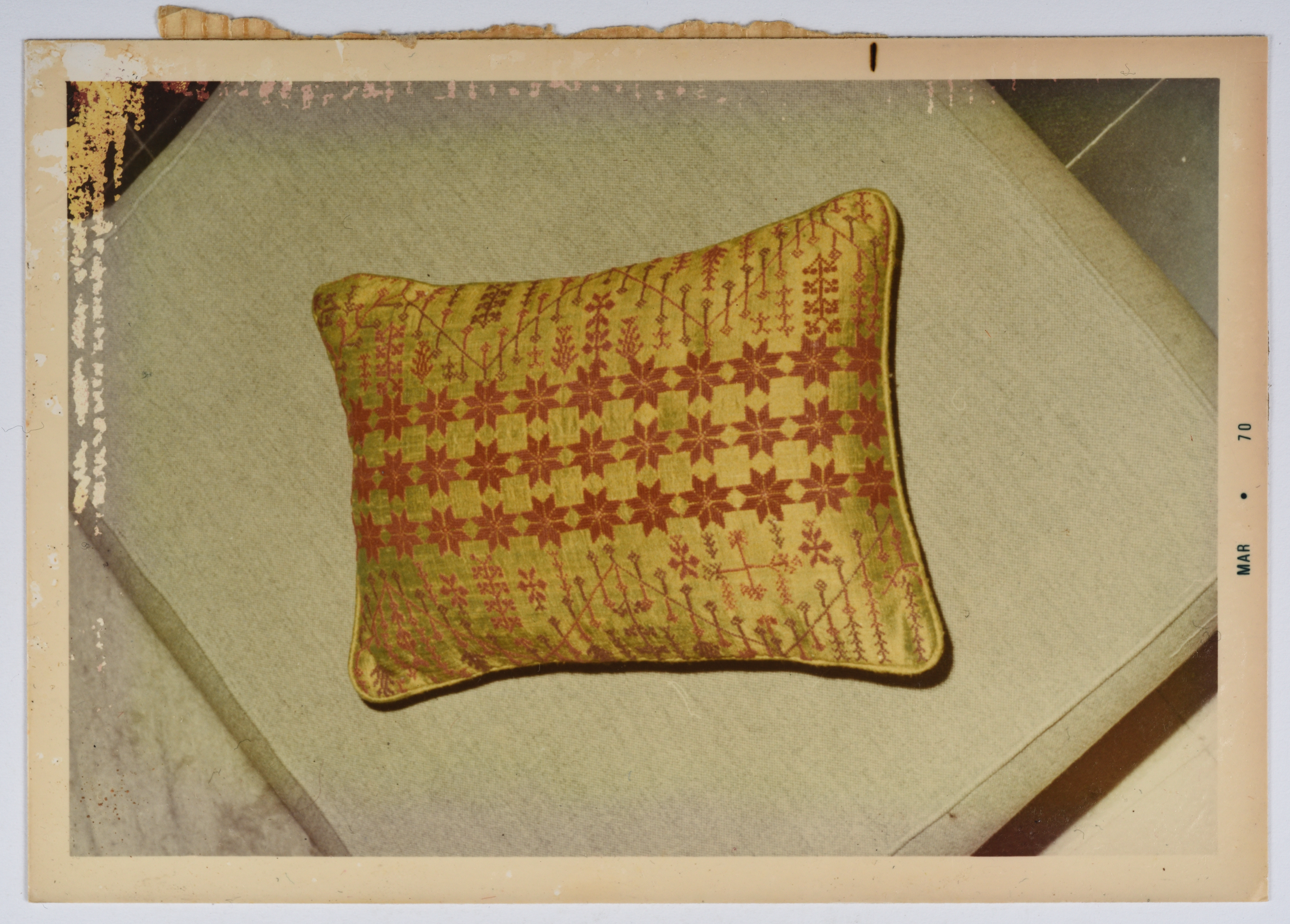 صورة ملونة، يظهر فيها أعمال تطريز يدوي فلسطيني من انتاج جمعية انعاش المخيم.