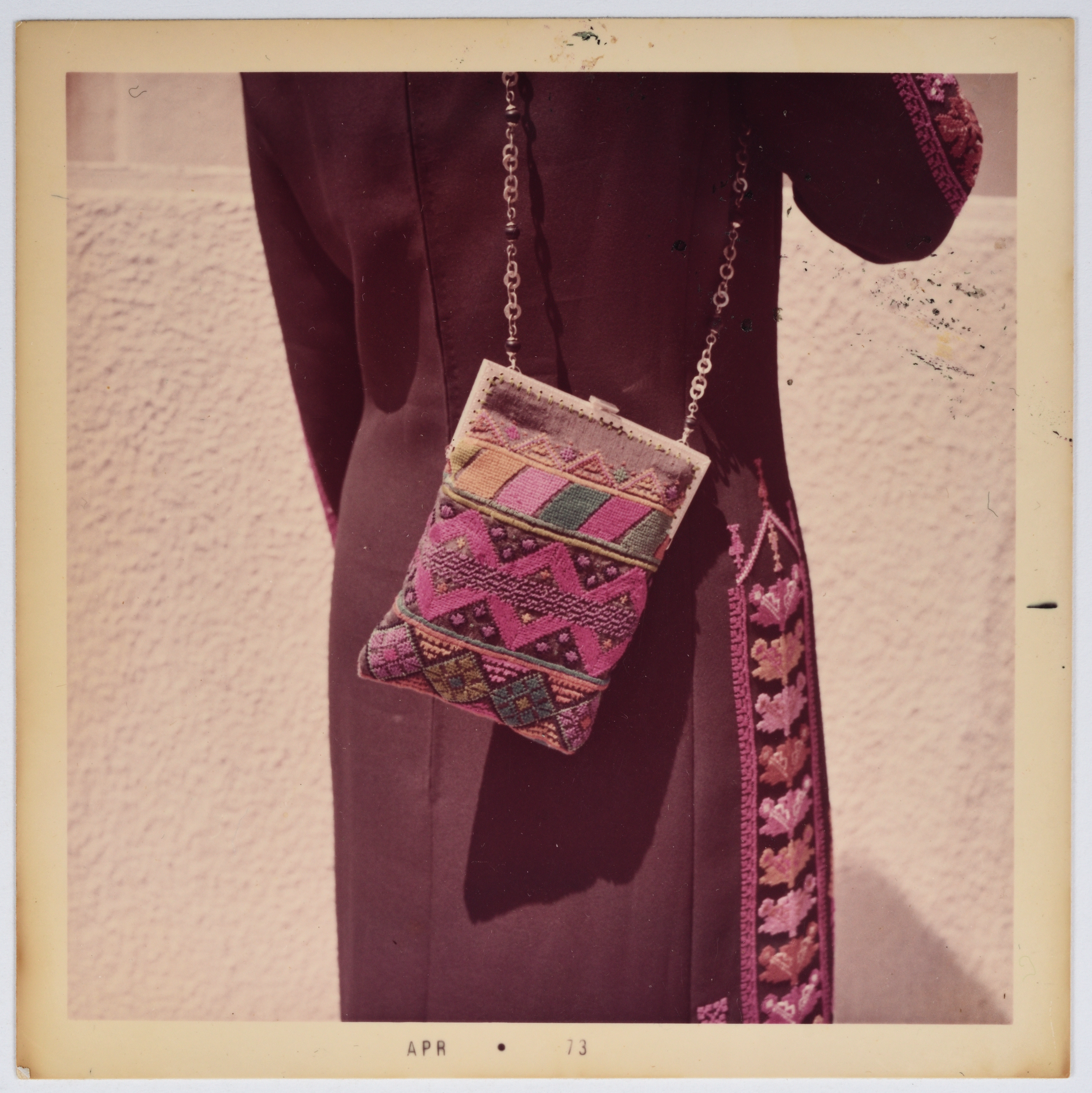A colour photograph showing a model wearing a Palestinian handmade embroidered products produced by the Association for the Development of Palestinian Camps (INAASH).