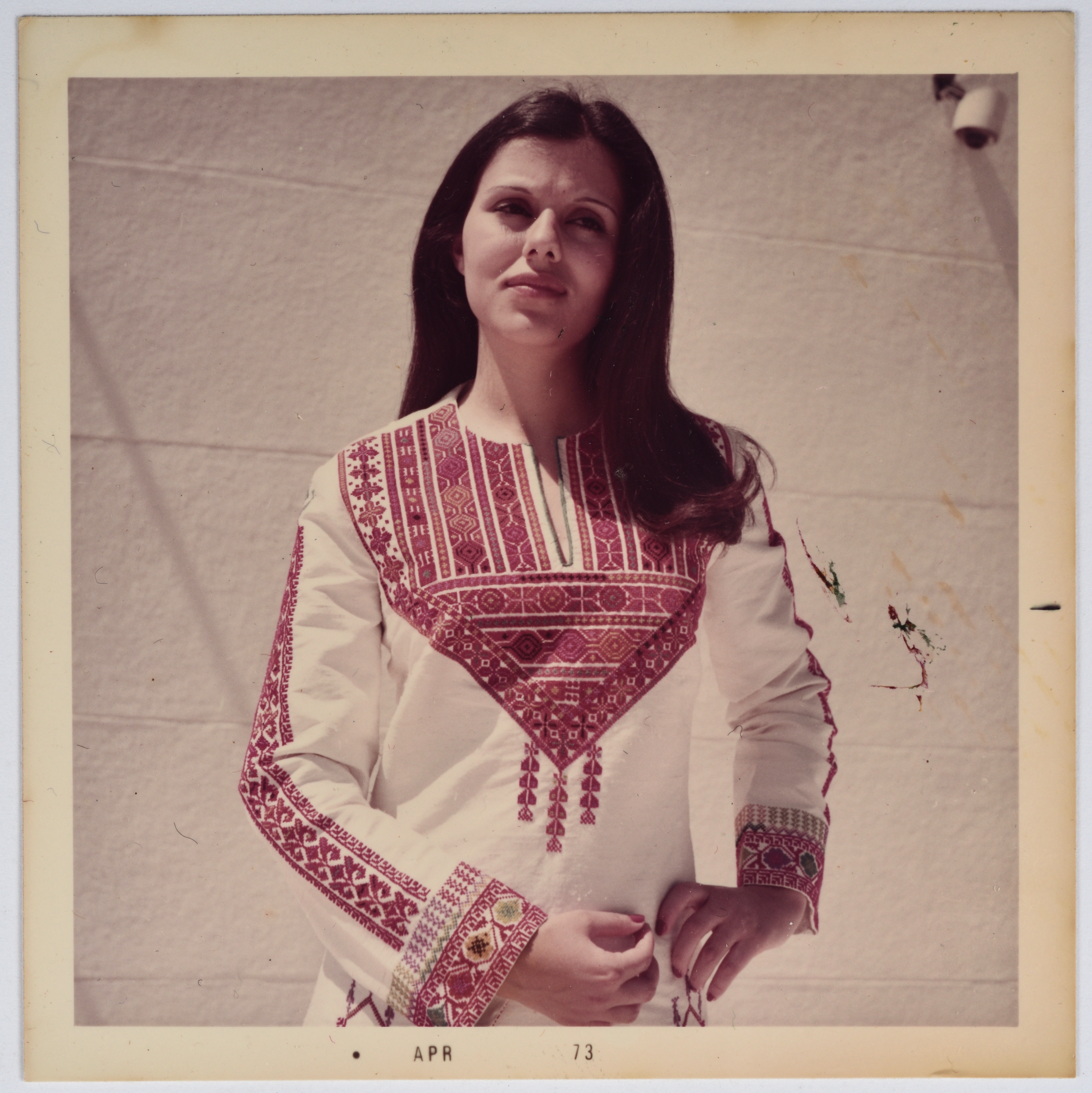 A colour photograph showing a model wearing a Palestinian handmade embroidered products produced by the Association for the Development of Palestinian Camps (INAASH).