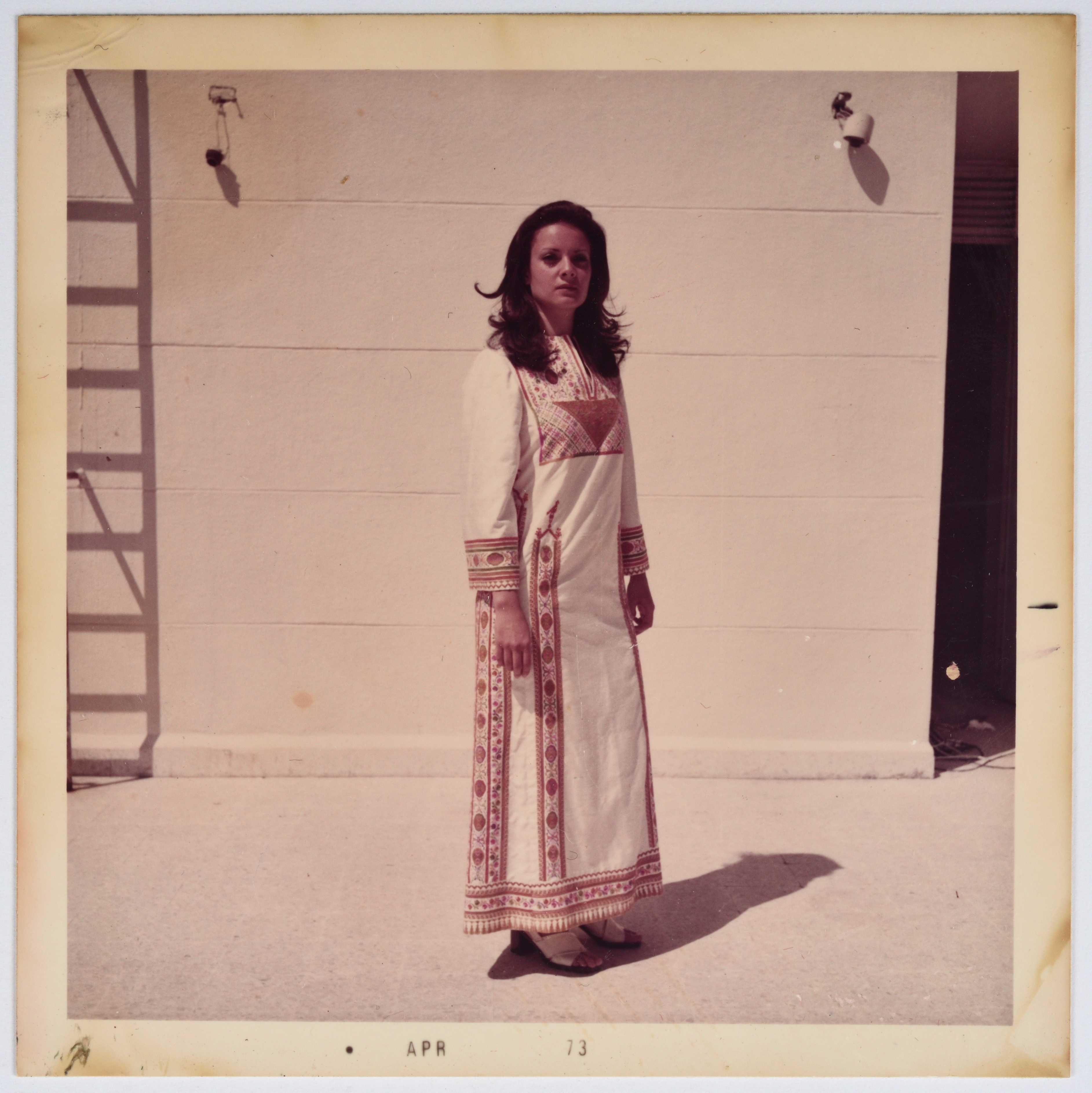 A colour photograph showing a model wearing a Palestinian handmade embroidered products produced by the Association for the Development of Palestinian Camps (INAASH).