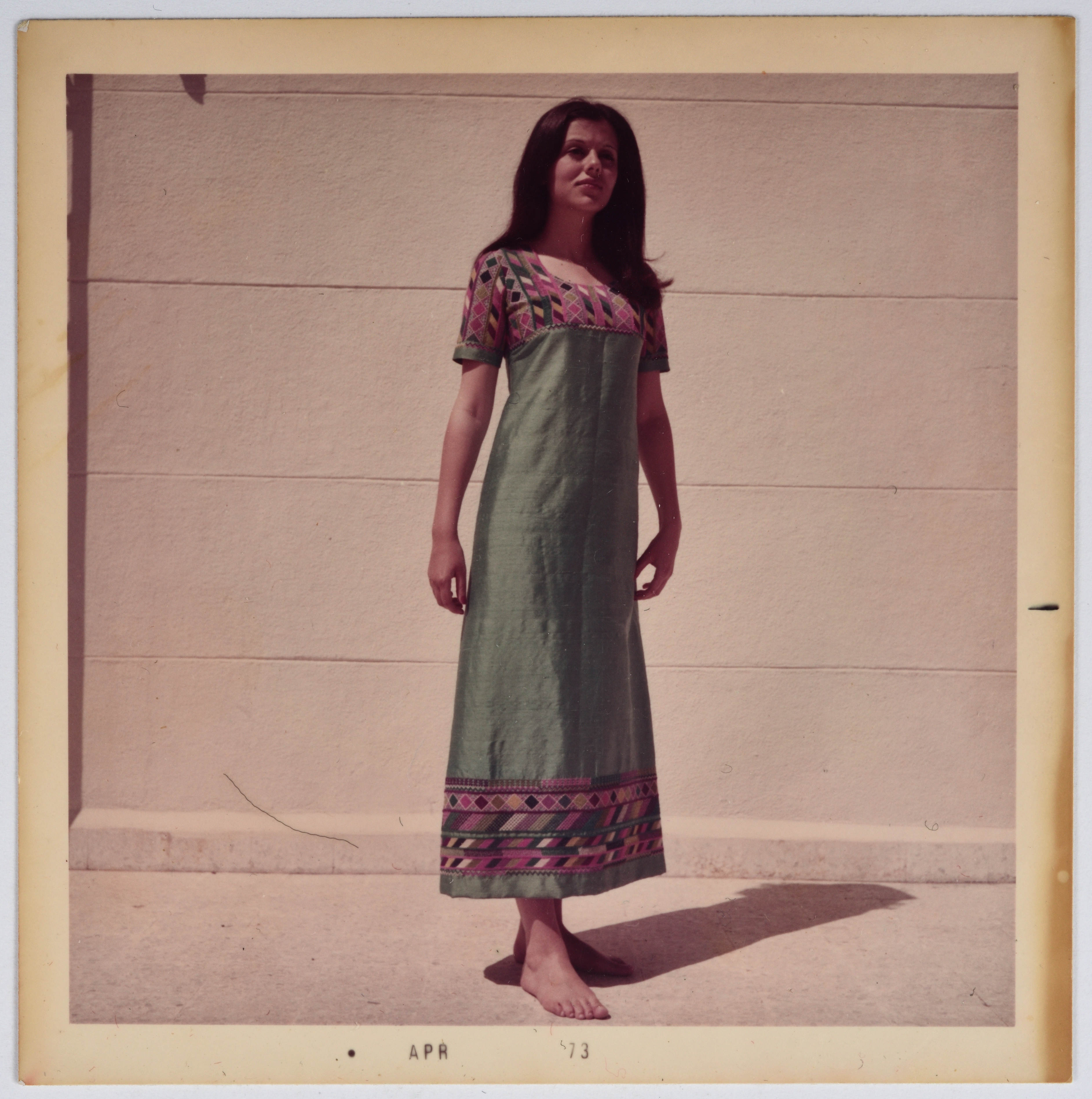 A colour photograph showing a model wearing a Palestinian handmade embroidered products produced by the Association for the Development of Palestinian Camps (INAASH).