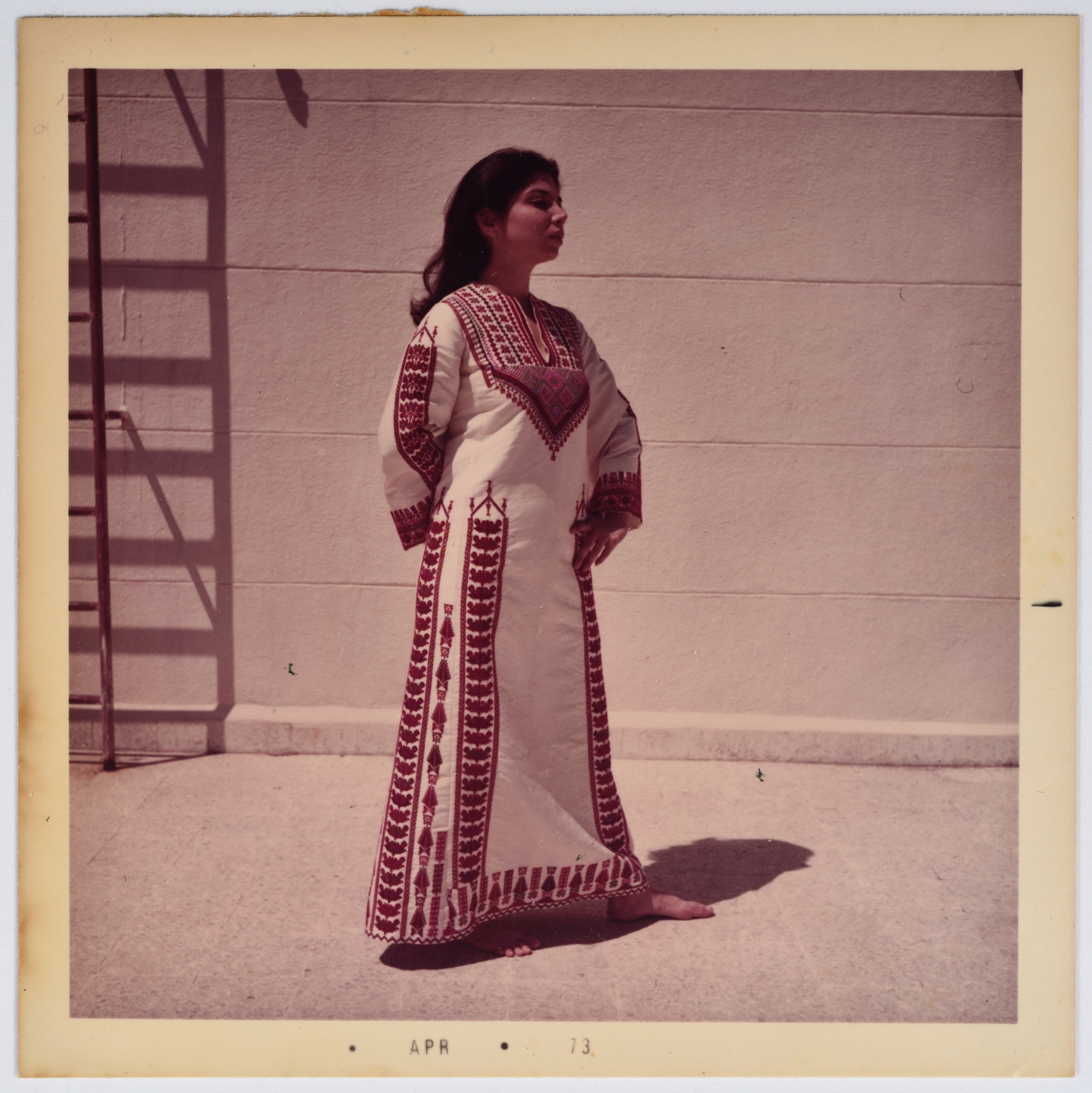 A colour photograph showing a model wearing a Palestinian handmade embroidered products produced by the Association for the Development of Palestinian Camps (INAASH).