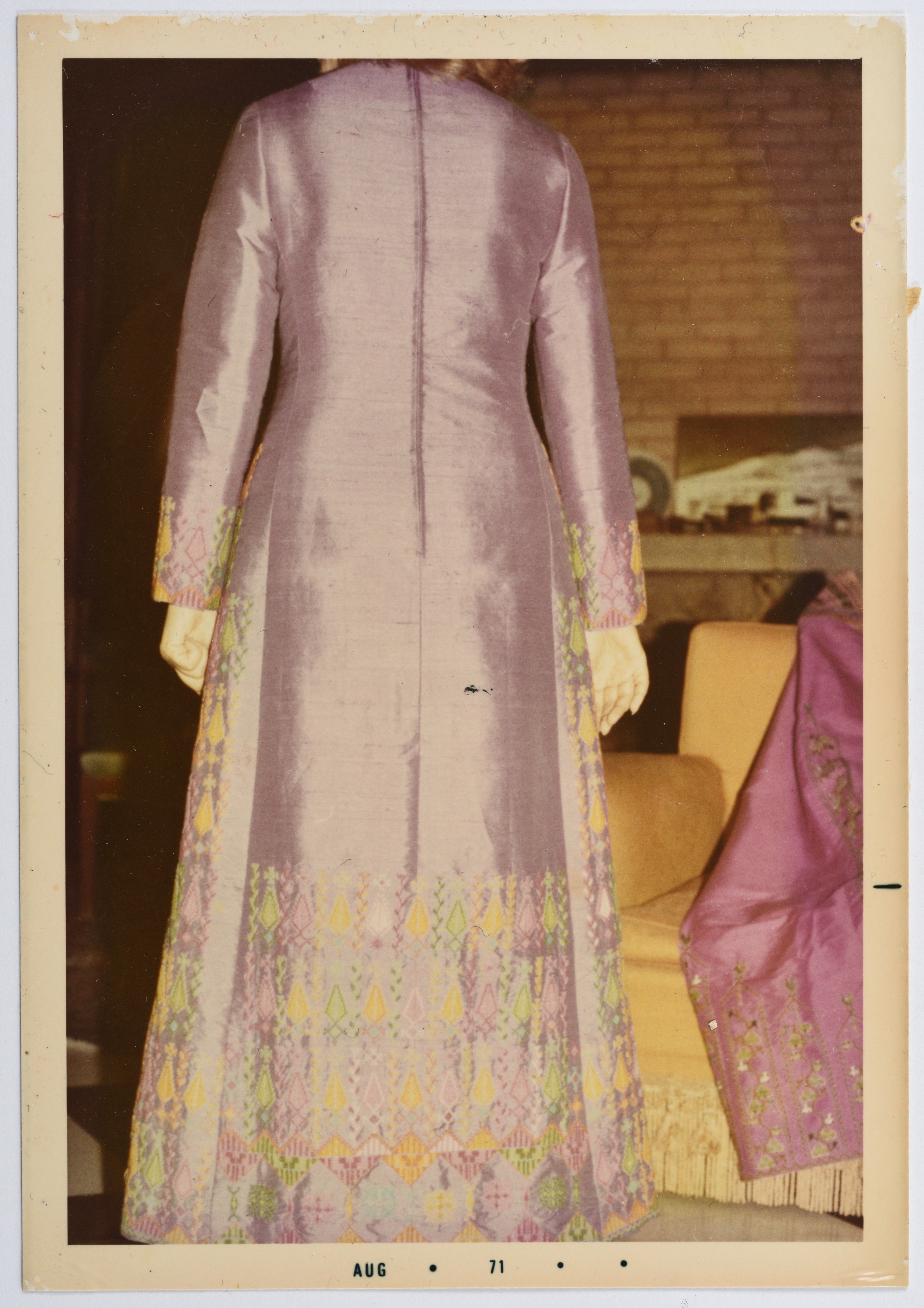 A colour photograph showing a model wearing a Palestinian handmade embroidered products produced by the Association for the Development of Palestinian Camps (INAASH).
