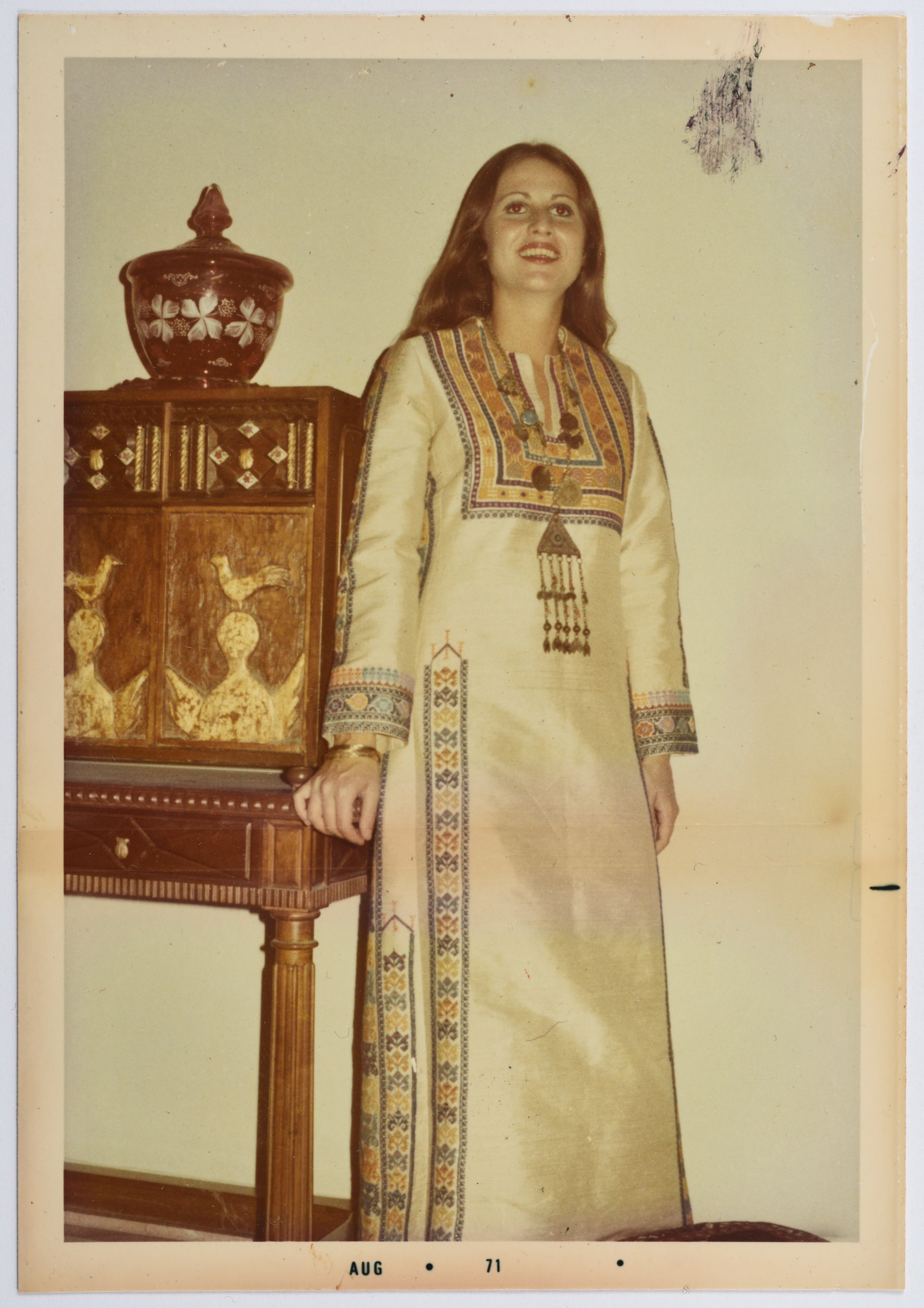 صورة ملونة، يظهر فيها أعمال تطريز يدوي فلسطيني من انتاج جمعية انعاش المخيم.