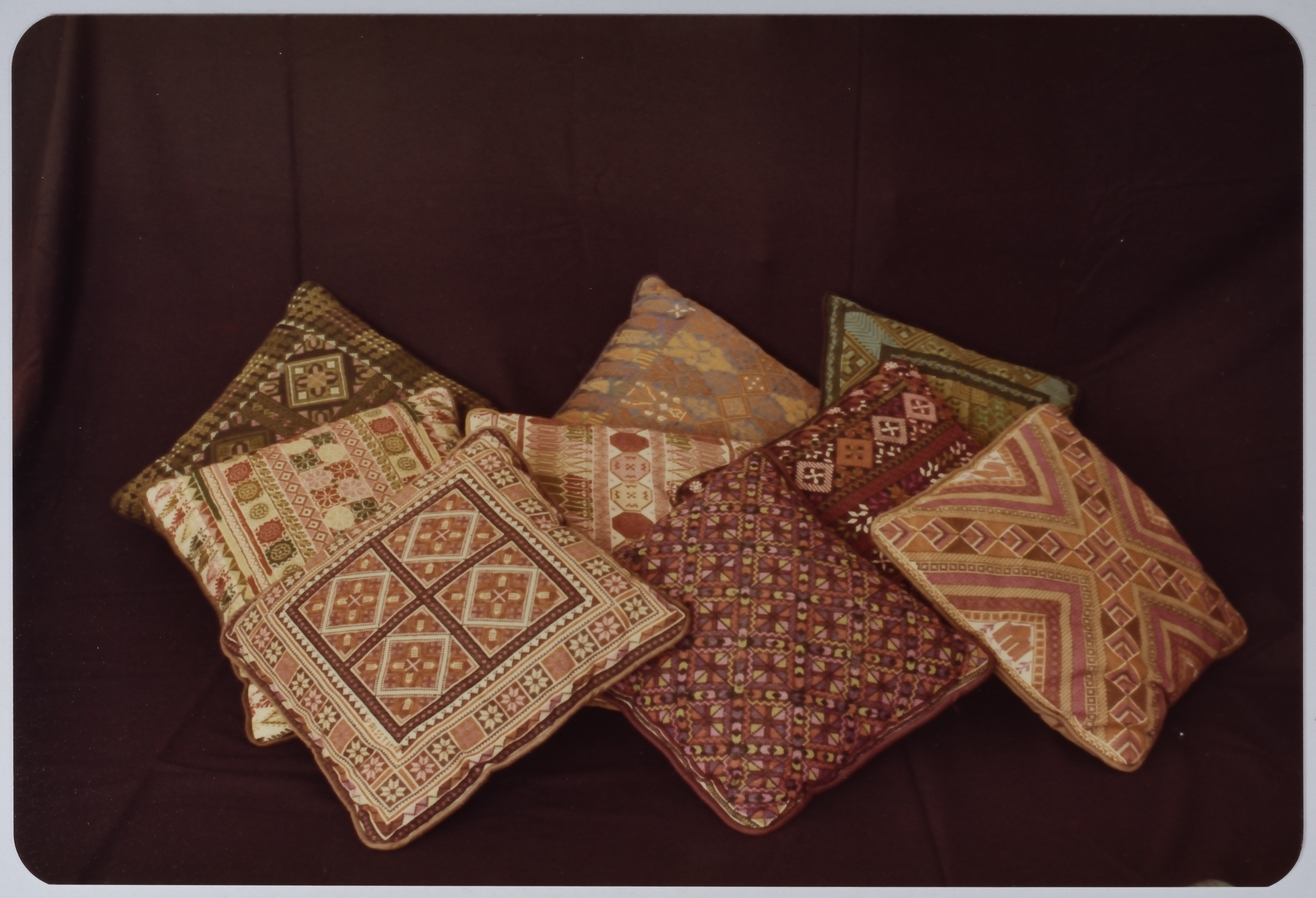 صورة ملونة، يظهر فيها أعمال تطريز يدوي فلسطيني من انتاج جمعية انعاش المخيم.