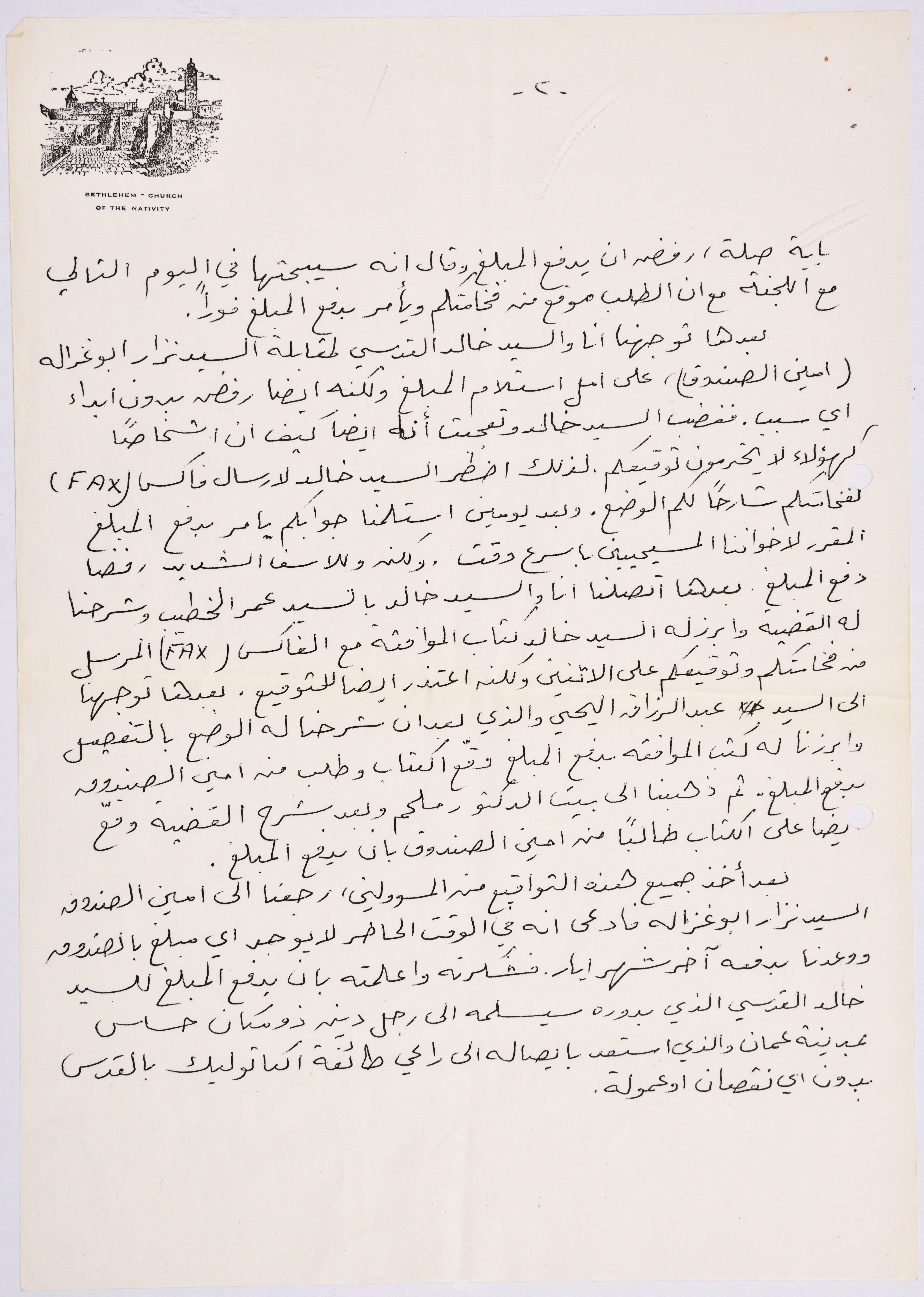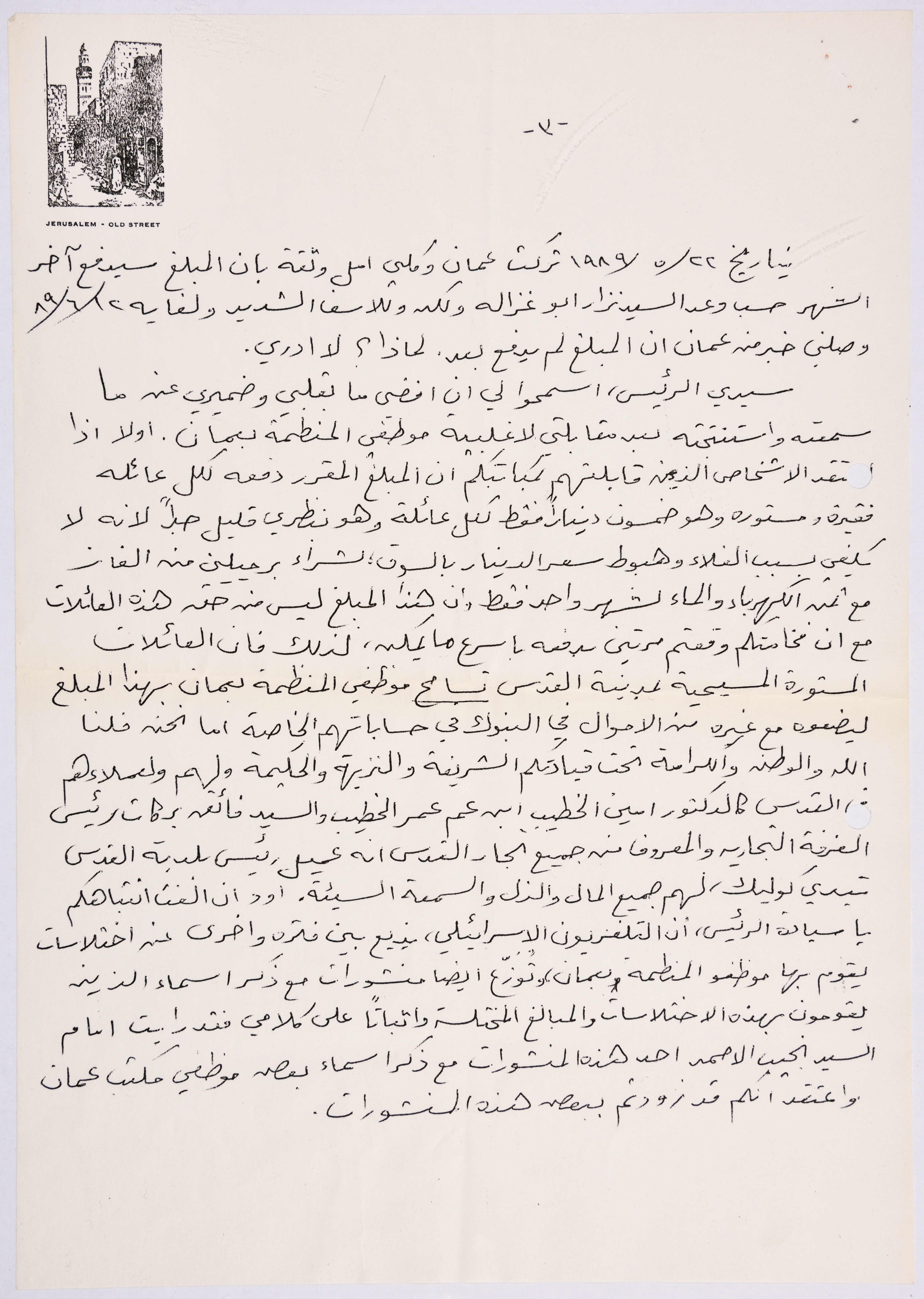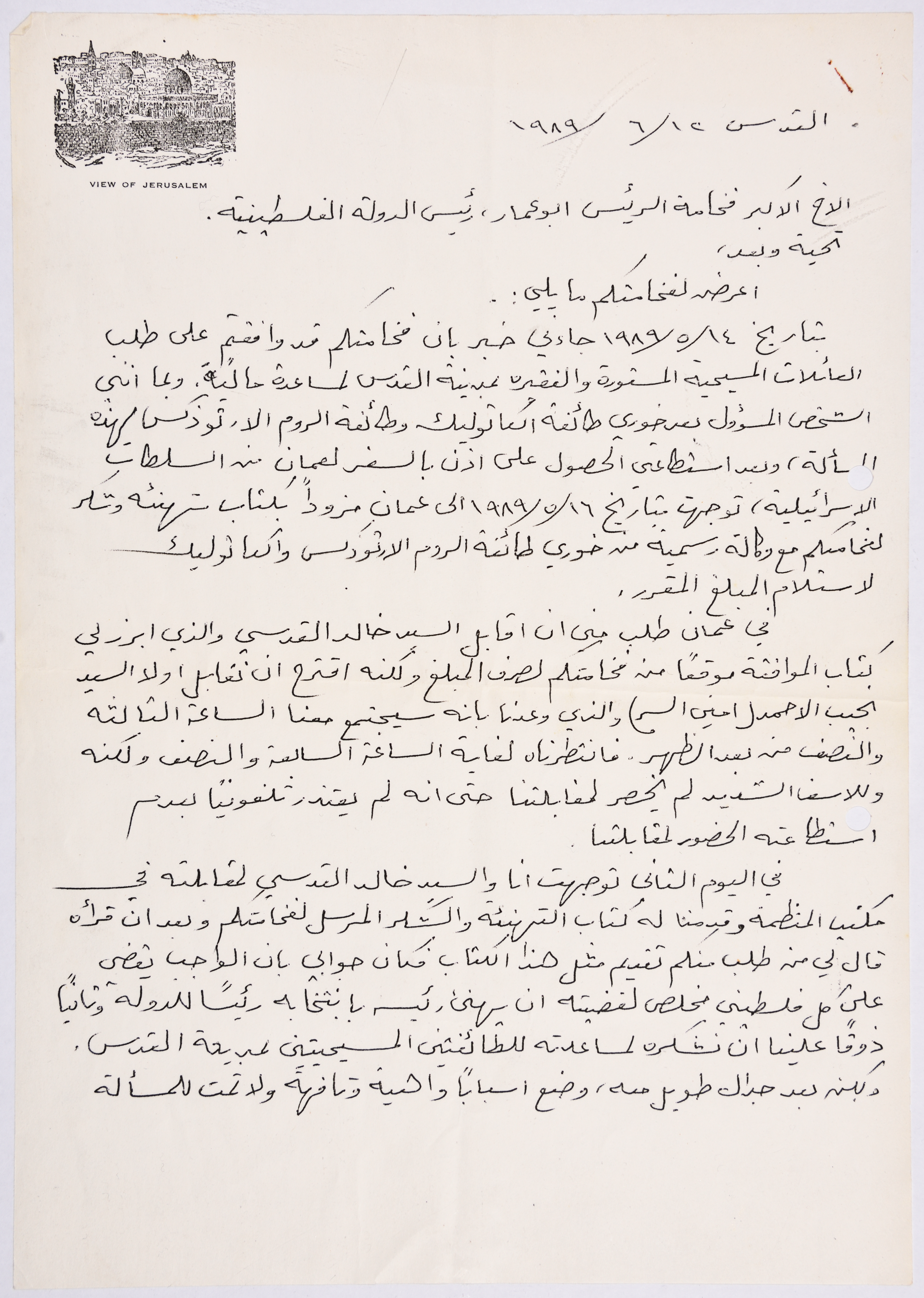 رسالة من مرح ترزي إلى ياسر عرفات عام 1989، بخصوص وضع العائلات المسيحية في القدس المُحتلّة خلال الانتفاضة الأولى، وعدم تلقيهم مساعدات مالية.