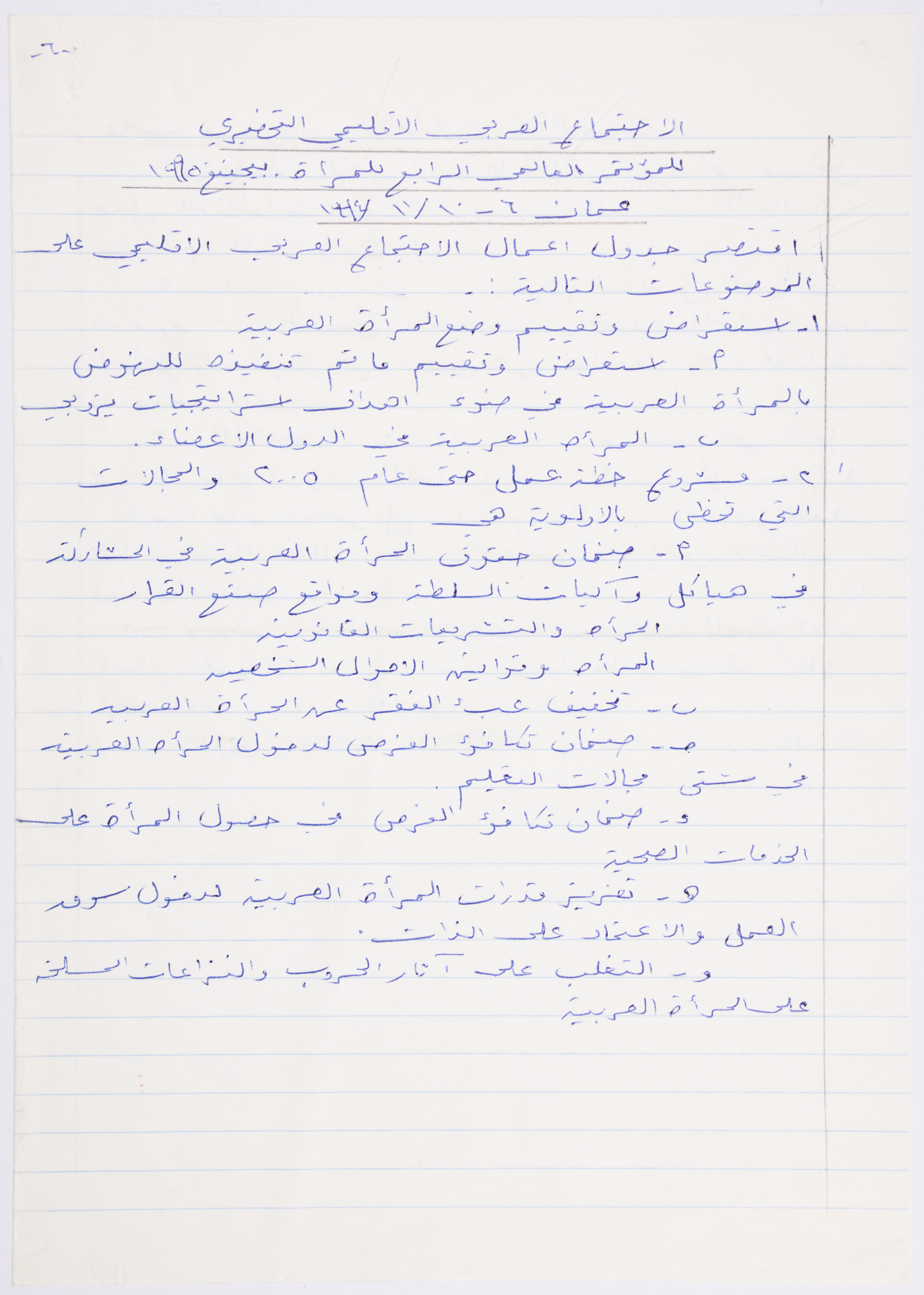 جدول أعمال الاجتماع العربي الإقليمي التحضيري للمؤتمر العالمي الرابع للمرأة في بكين الذي انعقد في بكين- الصين عام 1995. وجُد مكتوب بخط اليد في أرشيف ليلى ترزي.