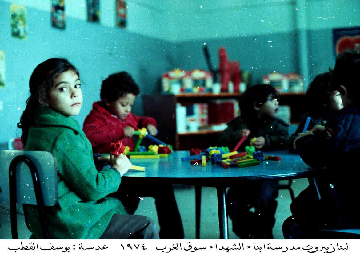 صورة ملونة، يظهر فيها أطفال من ابناء شهداء مدرسة سوق الغرب عام 1974.