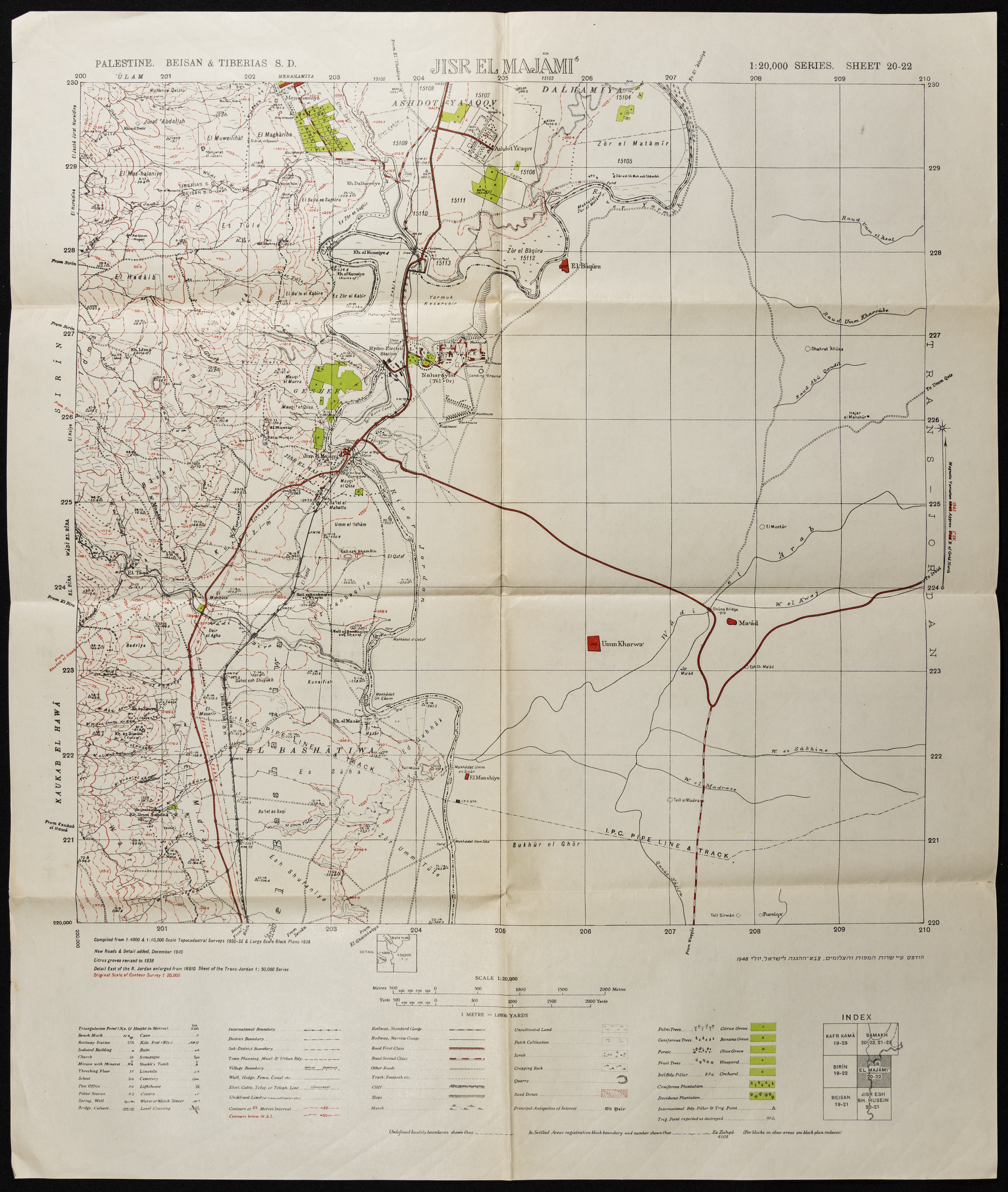 خارطة تُظهِر الحدود والطرق بأنواعها والأماكن المقدسة والطبيعة الطوبغرافية من تلال وسهول ومنحدرات والتشكيلة الطبيعية للأرض وأنواع المزروعات. نُشرت الخريطة فترة الانتداب البريطاني، تم إضافة تعديلات عليها من قِبَل خدمة الخرائط والصور التابعة للقوات العسكرية الاسرائيلية فترة الأربعينيات.