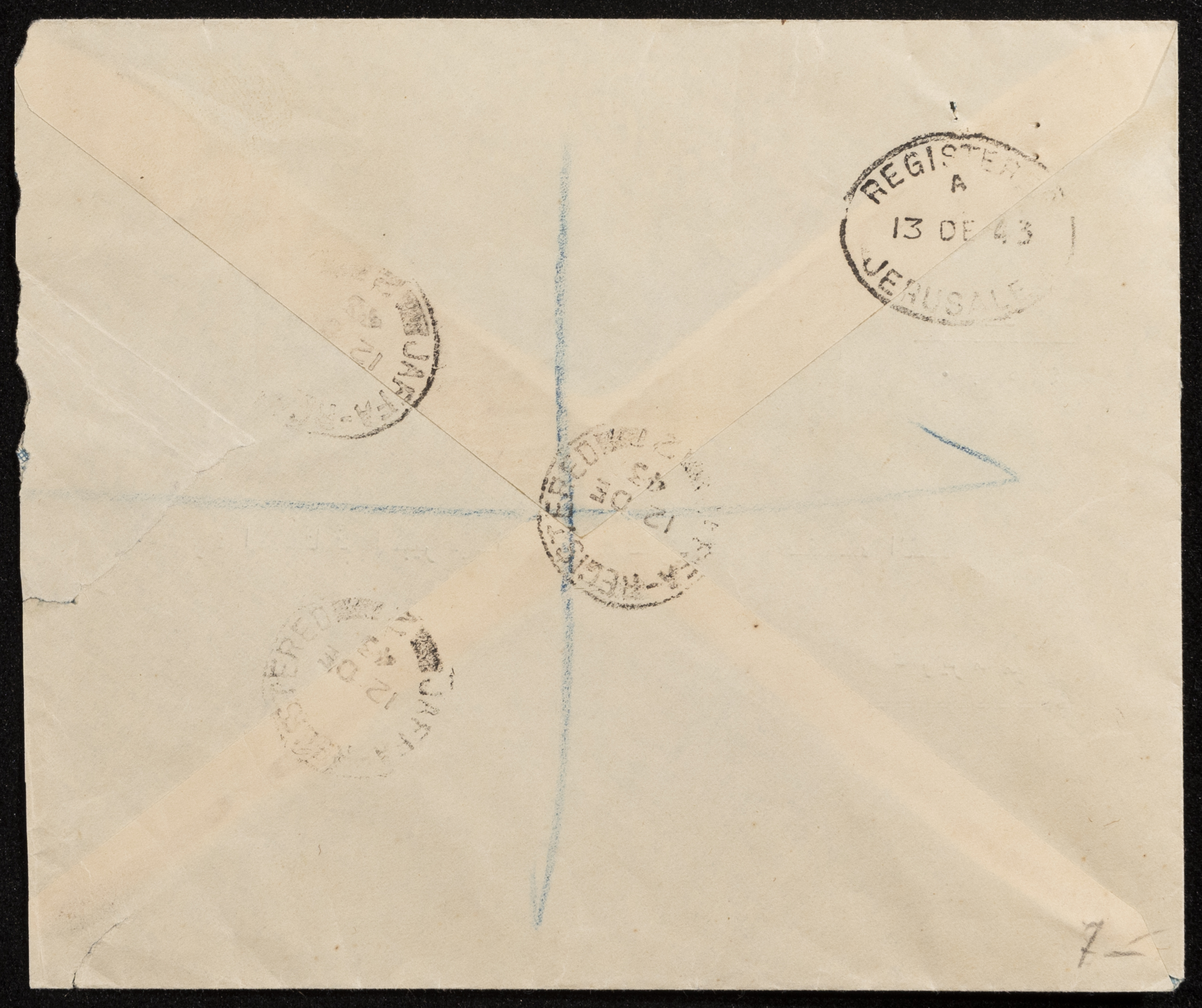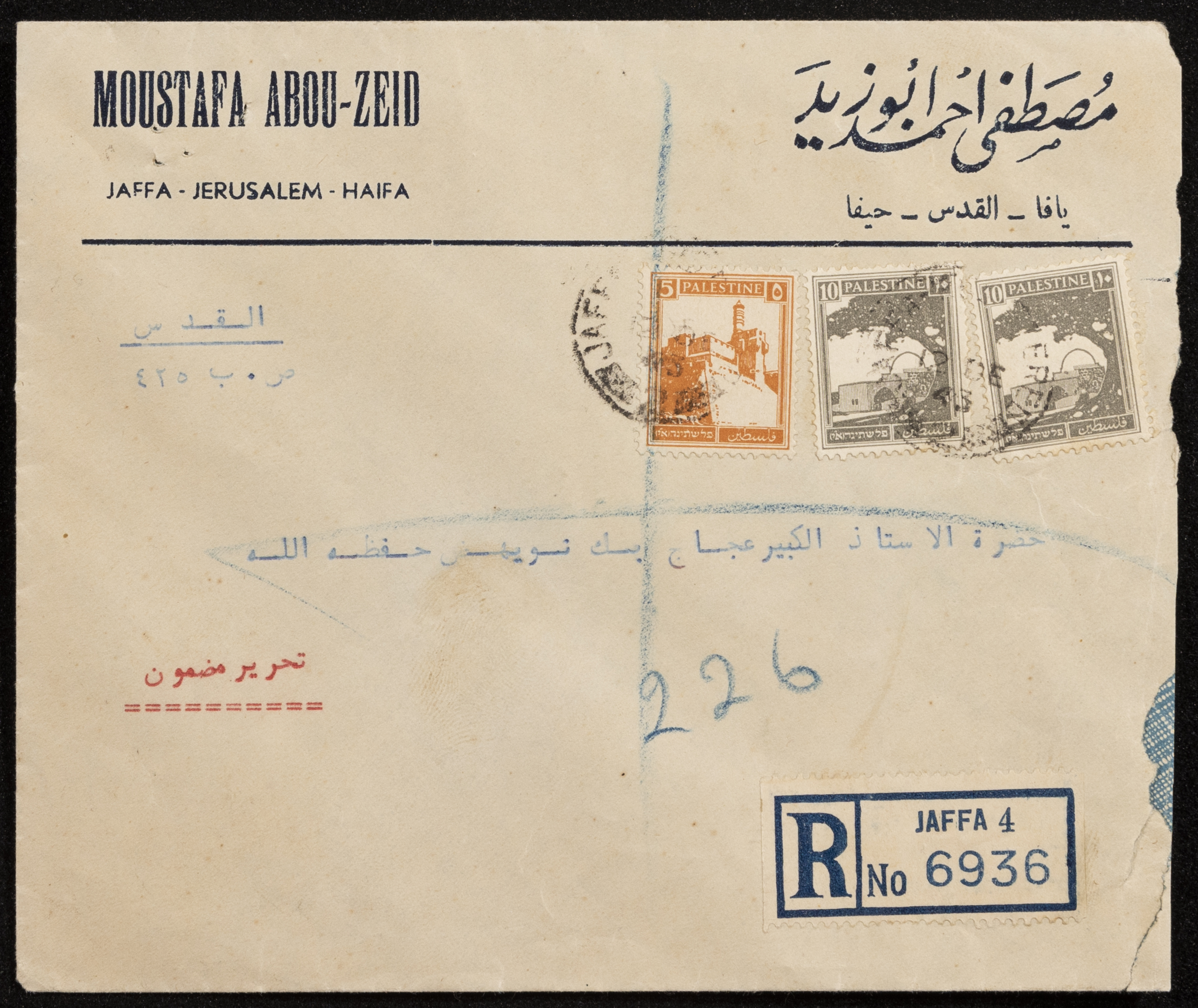 غلاف رسالة صادرة عن مكتب شخص يدعى "مصطفى احمد أبو زيد" إلى عجاج نويهض في القدس
