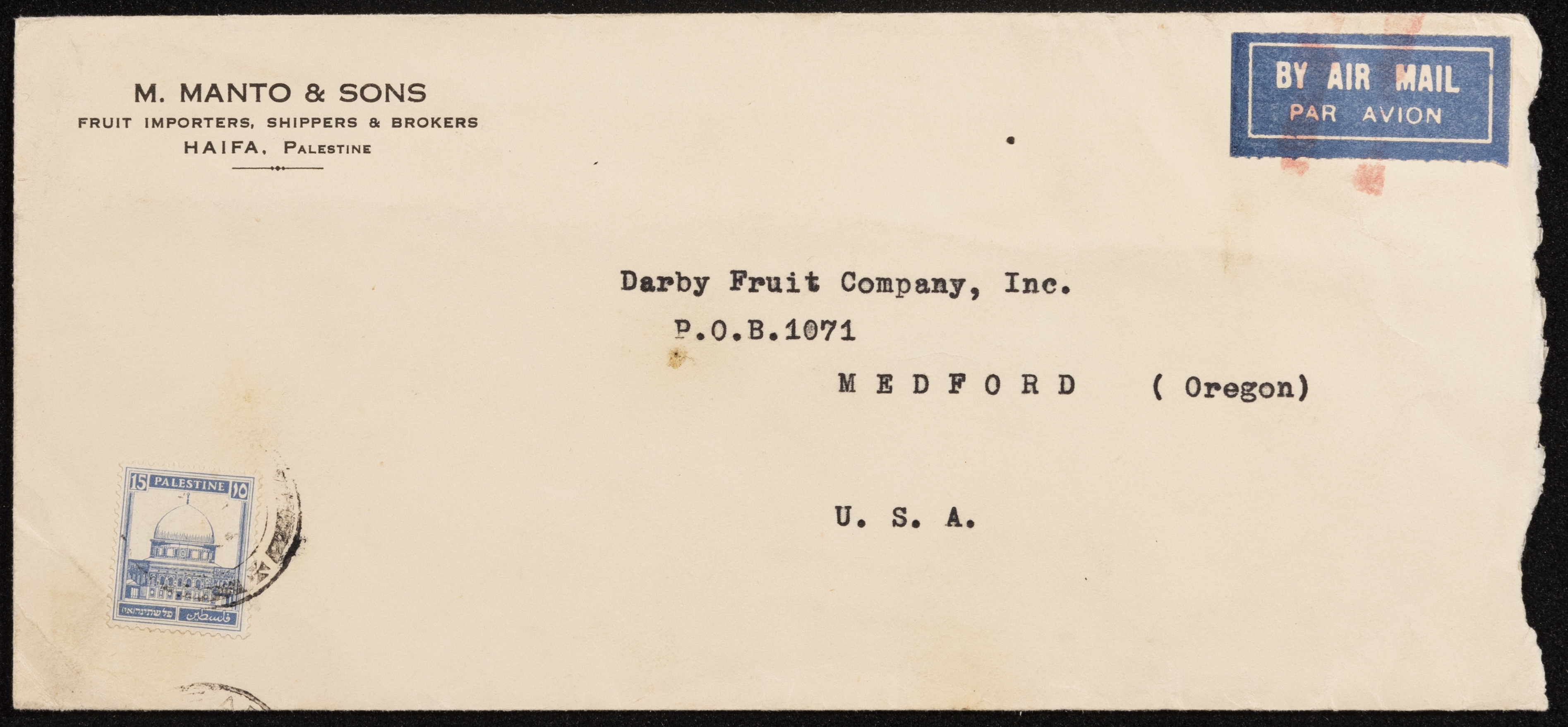 غلاف رسالة وصلت جواً إلى "شركة م. مانتو وأولاده لاستيراد وشحن الفواكه" في حيفا من "شركة ديربي للفواكه" في ولاية أوريغون الأمريكية