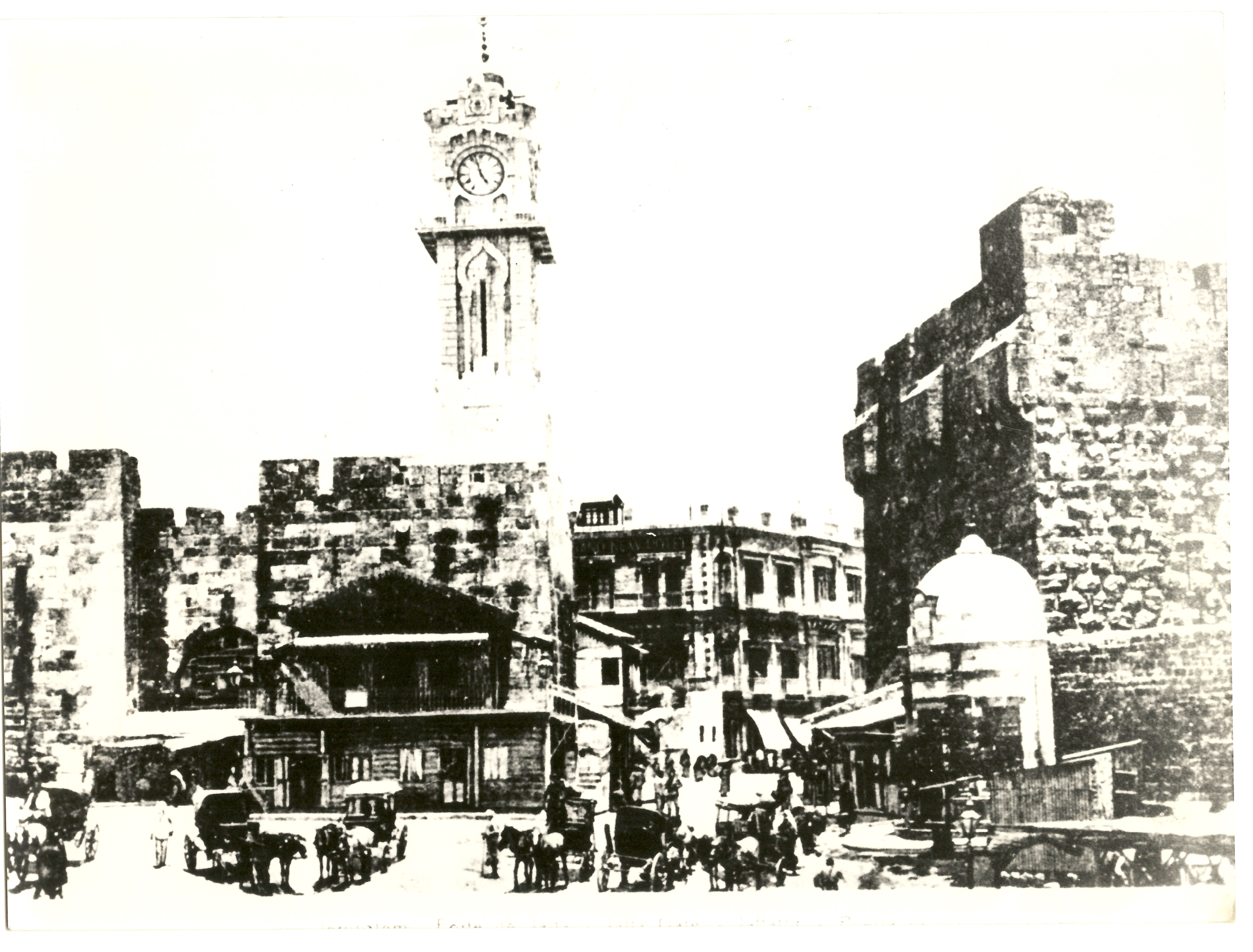 Taken in the 1920s, this photograph shows the Jaffa Gate and Clock Tower in Jerusalem.
