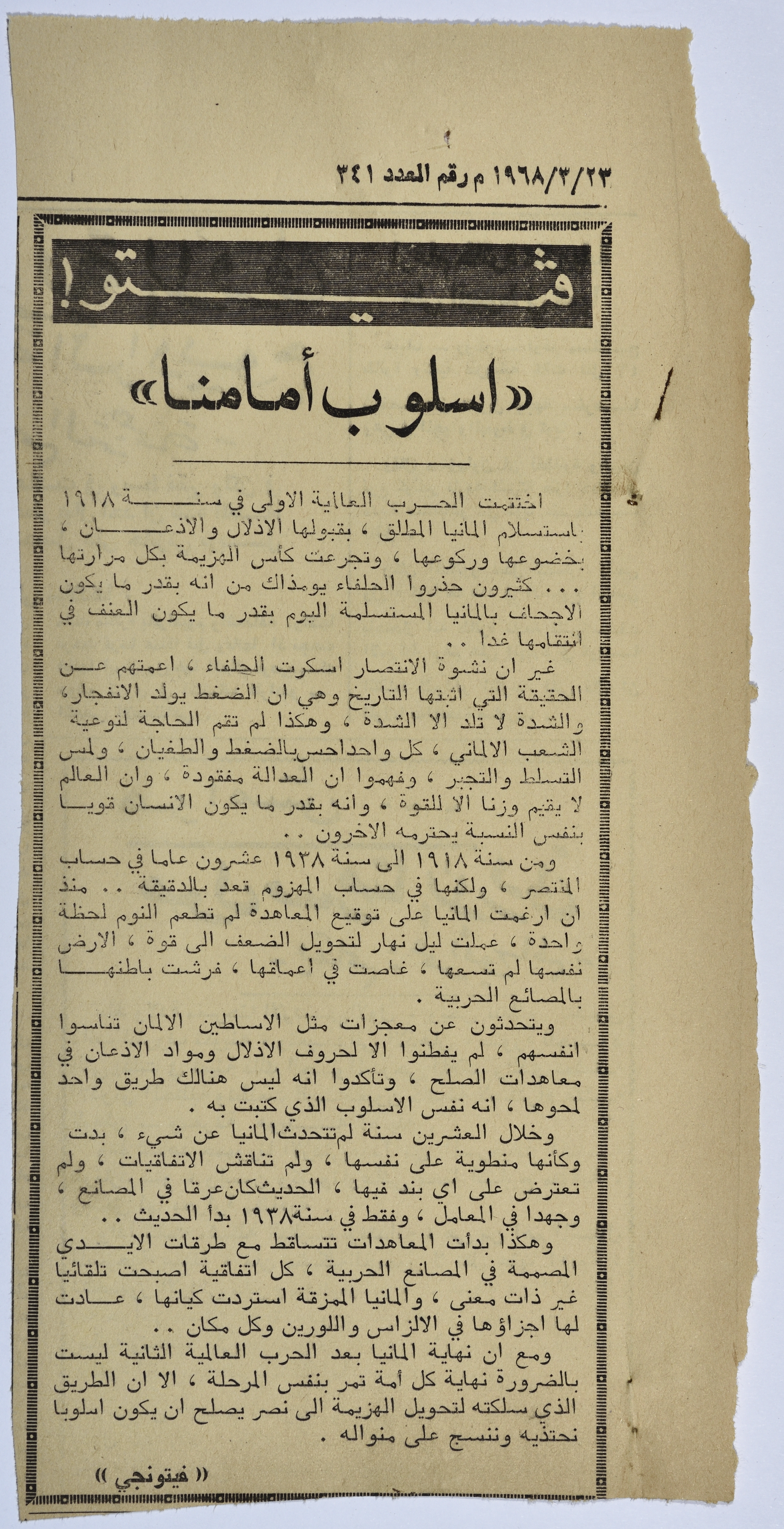 "أسلوب أمامنا"، قصاصة من جريدة فلسطين، 1968