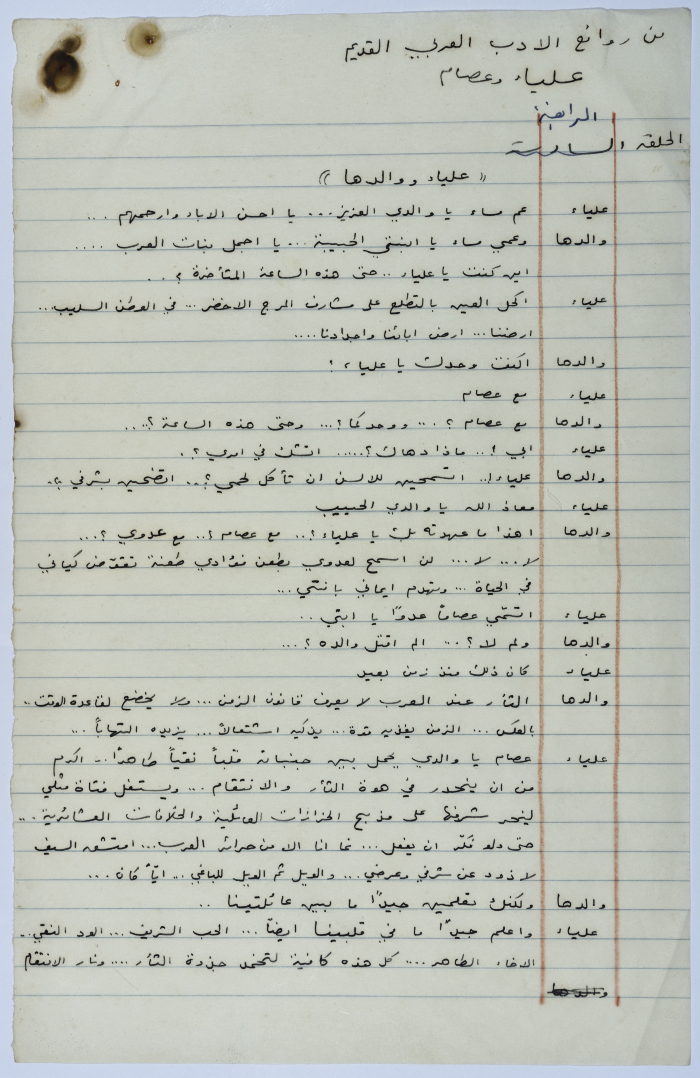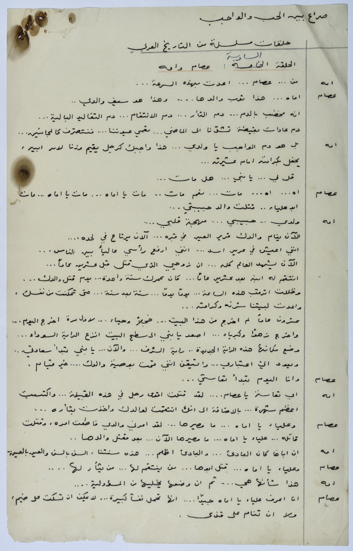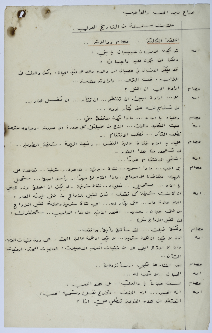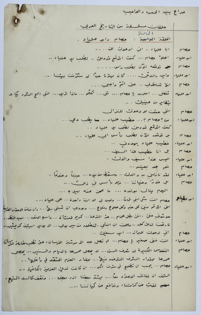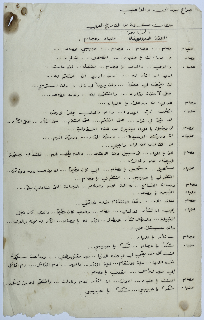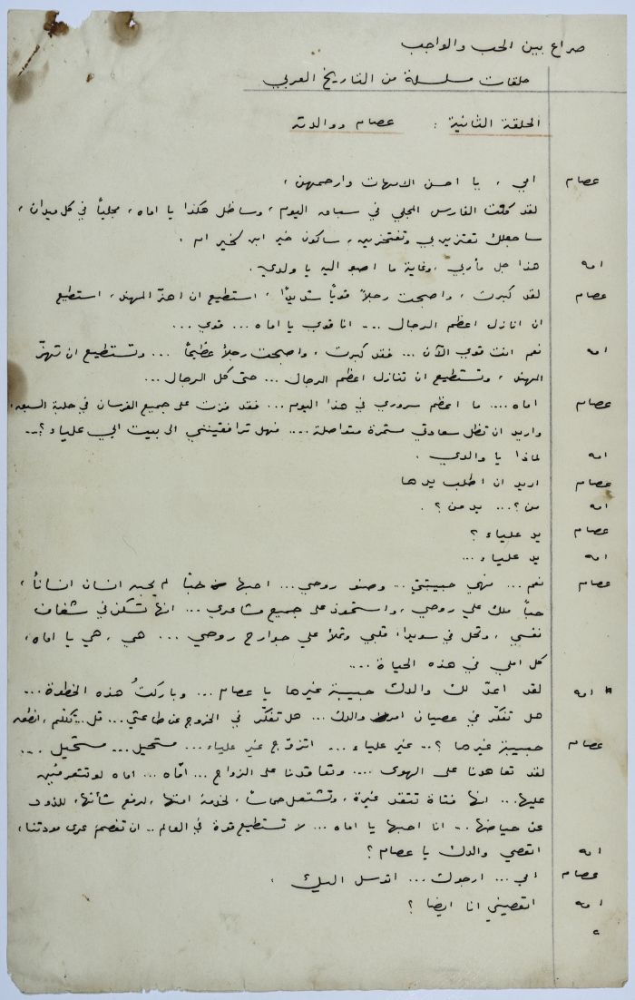 . مادة مطبوعة باللغة العربية، وهي قصة قصيرة كتبها يعقوب الشوملي، بعنوان "صراع بين الحب والواجب" حلقات مسلسلة من التاريخ العربي