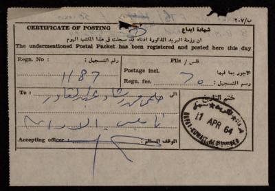 "شهادة إيداع" من رشاد عبد القادر، 11 نيسان 1964