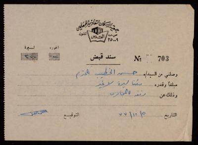 "Receipt", Issued by the Cooperative Housing Association to Hasan Khatib, 15 January 1977