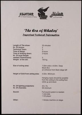 "زمن الحيتان"، نشرة بالتقنيات المطلوبة للمسرحية، مسرح عشتار
