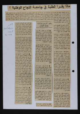 "ماذا يقرأ الطلبة في جامعة النجاح الوطنية"، قصاصة من صحيفة الفجر، 1986