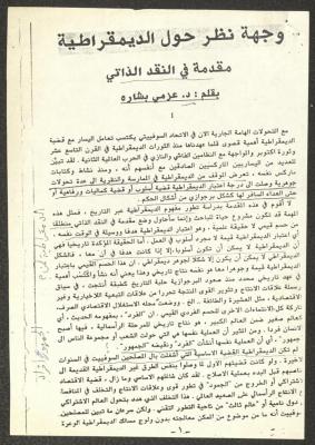 "وجهة نظر حول الديمقراطية"، مقدمة في النقد الذاتي لعزمي بشارة، حزيران 1989